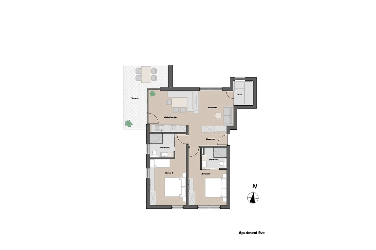 Im Apartment № FIVE entspannen Sie auf einer nach Südwesten ausgerichteten, voll möblierten und überdachten Terrasse.