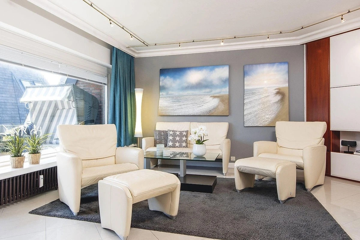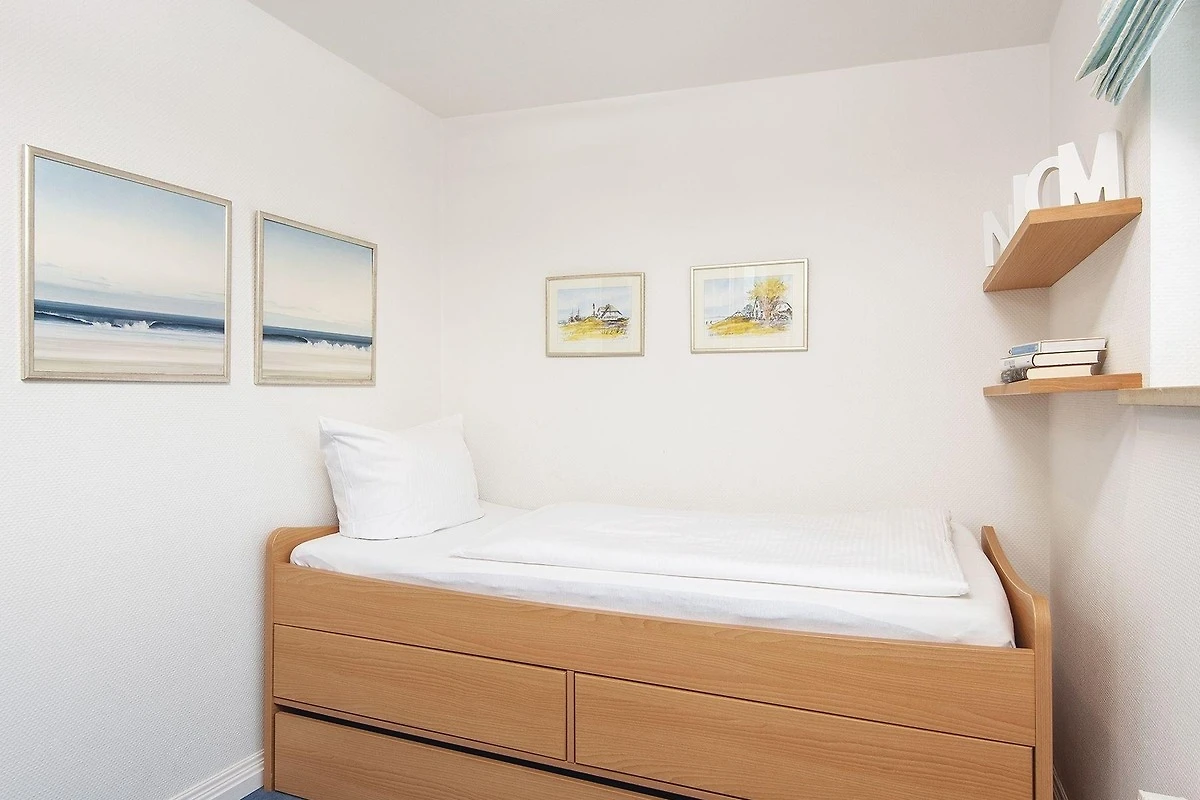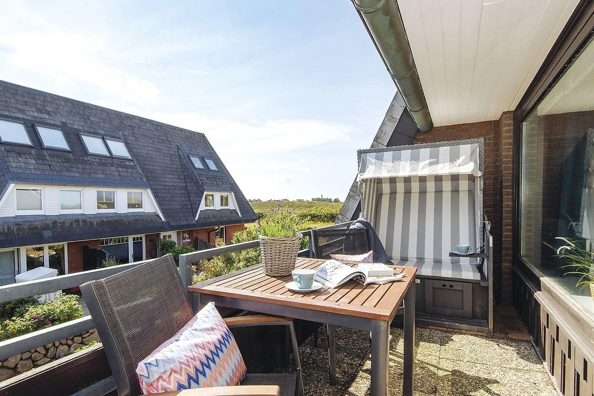 Dieses wohnliche Appartement liegt im 1. Obergeschoss eines hochwertigen Appartementhauses in der Kurhausstrasse. Über einen kleinen Flur erreichen Sie den gefliesten Wohnbereich, welcher sich in eine kleine offene Küche mit Essplatz für Vier, sowie ein Wohnzimmer mit Balkon samt Strandkorb und seitlichem Meerblick aufteilt. Das mit Teppichboden ausgelegte Obergeschoss erreichen Sie über eine offene Wendeltreppe. Hier hält das Quartier ein Doppelschafzimmer nebst durch einen Raumtrenner separierten Arbeitsplatz, ein Bad mit kleiner Wanne und ein Einzelschlafzimmer mit kleinem Duschbad en suite für Sie bereit. Ein funktionales Raumwunder für bis zu drei Gäste in bester Lage Kampens.
