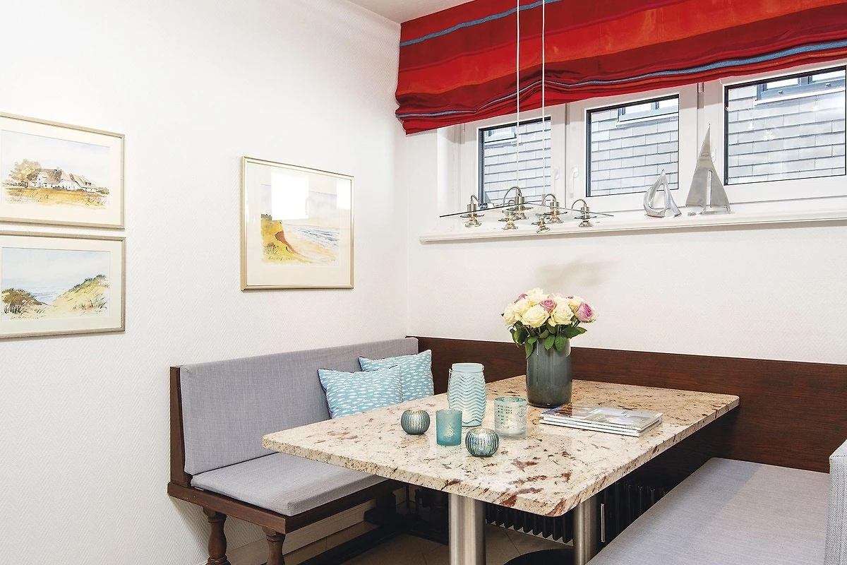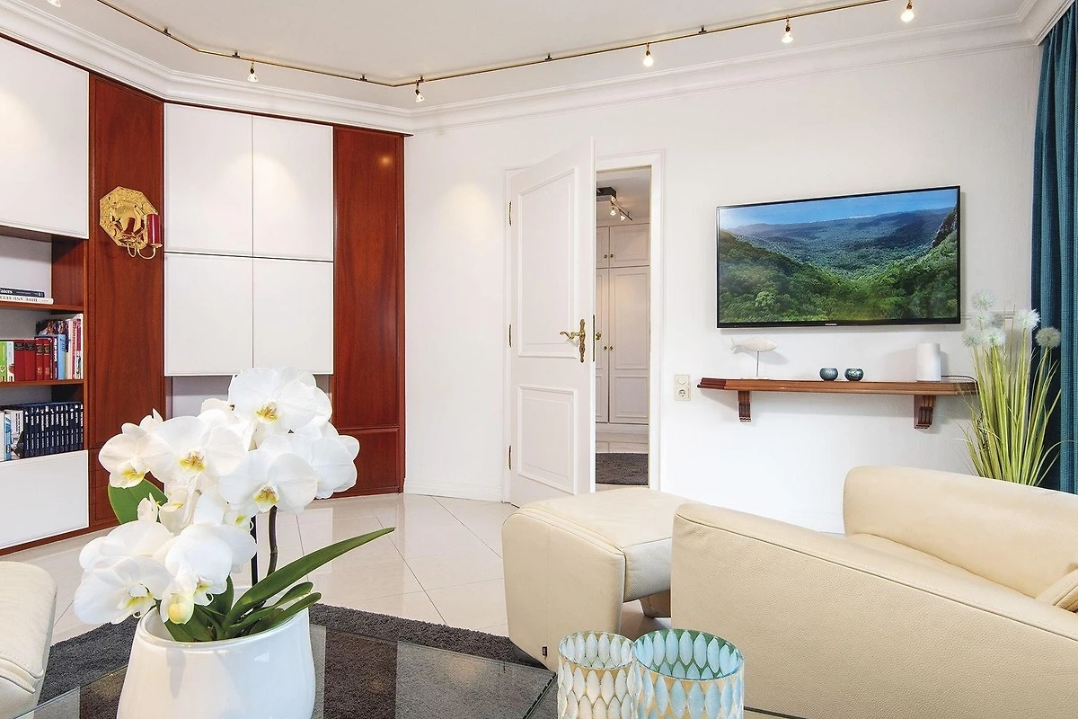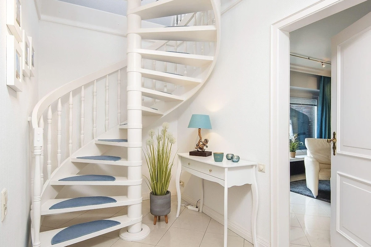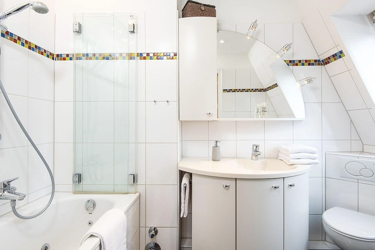 Dieses wohnliche Appartement liegt im 1. Obergeschoss eines hochwertigen Appartementhauses in der Kurhausstrasse. Über einen kleinen Flur erreichen Sie den gefliesten Wohnbereich, welcher sich in eine kleine offene Küche mit Essplatz für Vier, sowie ein Wohnzimmer mit Balkon samt Strandkorb und seitlichem Meerblick aufteilt. Das mit Teppichboden ausgelegte Obergeschoss erreichen Sie über eine offene Wendeltreppe. Hier hält das Quartier ein Doppelschafzimmer nebst durch einen Raumtrenner separierten Arbeitsplatz, ein Bad mit kleiner Wanne und ein Einzelschlafzimmer mit kleinem Duschbad en suite für Sie bereit. Ein funktionales Raumwunder für bis zu drei Gäste in bester Lage Kampens.