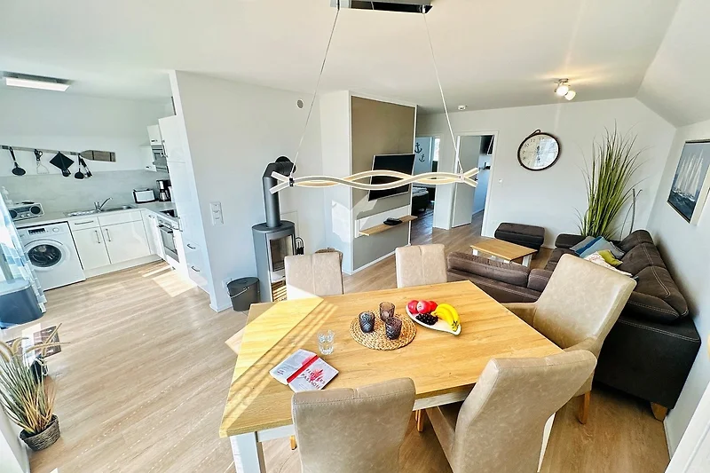 Im Wohn- und Essbereich mit bodentiefen Fenstern können Sie es sich auf dem komfortablen Ecksofa mit Schlaffunktion gemütlich machen und Ihren Lieblingsfilm auf dem 55-Zoll Smart-TV geniesen. Mit Telekom Entertain, Hifi Anlage und kostenfreiem Wlan stehen Ihnen eine Vielzahl von Unterhaltungsoptionen zur Verfügung.