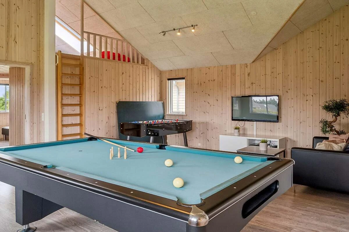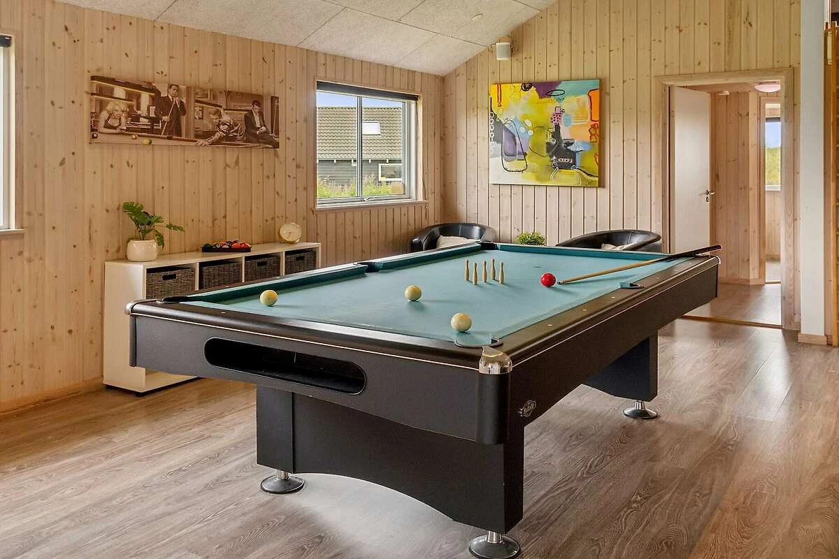 Ferienhaus in Marielyst für bis zu 16 Personen. Nahe dem beliebten Strand von Marielyst gelegen, bietet es ideale Voraussetzungen für einen Aktivurlaub für die ganze Familie. Kleine Wasserratten können sich im 18 m² großen Privatpool mit Gegenstromanlage und Rutsche austoben. Für mehr Entspannung stehen Ihnen sowohl eine Sauna als auch ein großer Whirlpool zur Verfügung. Die große und helle Küche ist in das geräumige Wohnzimmer integriert, das den natürlichen Mittelpunkt für geselliges Beisammensein bildet. Hier können Sie Kartenspiele, ein gutes Buch oder einen Film genießen. Im Aktivitätsraum können Sie sich gegenseitig zu einer Partie Billard, Tischtennis, Darts, PlayStation 4, Wii oder Tischfußball herausfordern. Die Schlafbereiche des Hauses verteilen sich auf zwei Schlafzimmer mit eigenem Bad und einen gemütlichen Dachboden mit Flachbildfernseher. Ein Safe ist ebenfalls vorhanden. Es gibt außerdem zahlreiche Outdoor-Aktivitäten, darunter einen Pétanque-Platz, ein Fußballtor, einen Sandkasten und Schaukeln. An Sommertagen bietet die große Terrasse viel Platz zum Sonnenbaden und dank der teilweisen Überdachung kann zu jeder Jahreszeit auf dem Weber-Grill gegrillt werden. Die Kaution und Nebenkosten werden im Servicebüro beglichen. Keine Vermietung an Jugendgruppen!