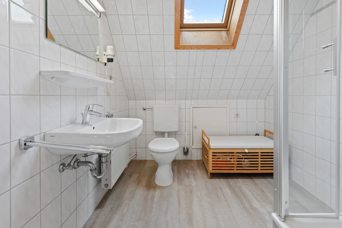 Das Badezimmer verfügt über eine Dusche und ein Fenster, um die frische Ostseeluft hereinzulassen.