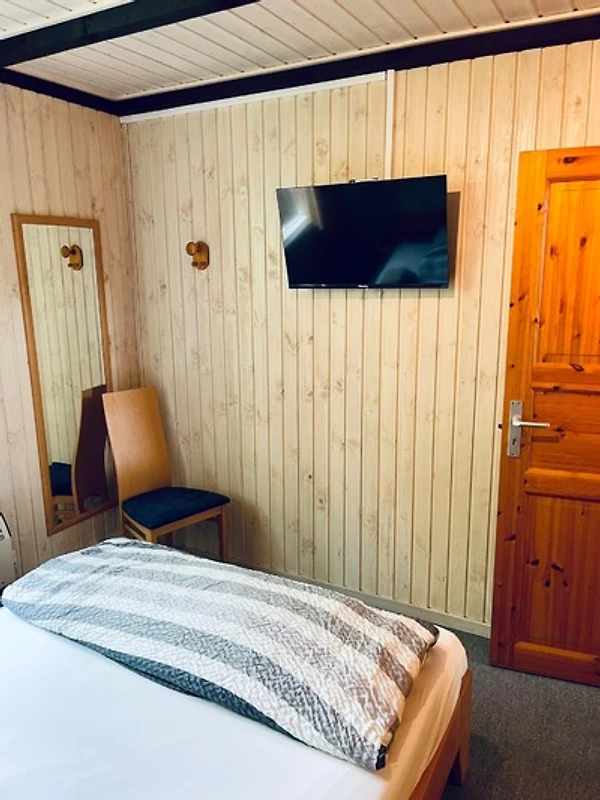 • Schlafzimmer im Erdgeschoss mit viel Stauraum & grossem Smart-TV