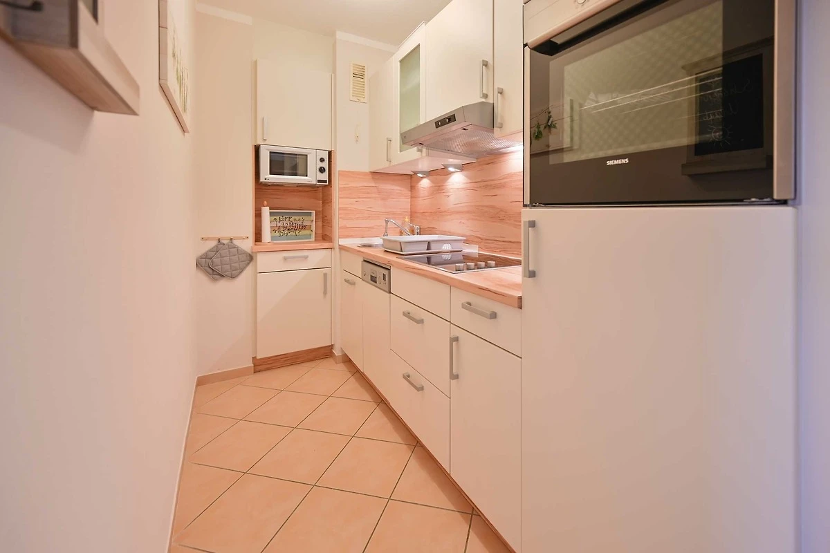 Die moderne und neue Einbauküche befindet sich separat vom Wohnbereich und verfügt über einen 4-Kochfelder-Ceranfeldherd, einen Backofen, eine Mikrowelle, eine Spülmaschine, eine Kaffeemaschine, einen Toaster, einen Wasserkocher und viele weitere Extras. Eine Kaffeemaschine und eine Senseo-Maschine steht Ihnen in der Küche zur Verfügung.