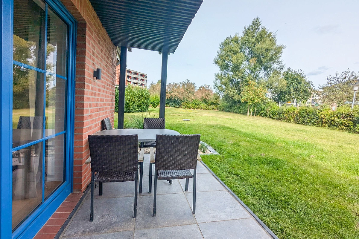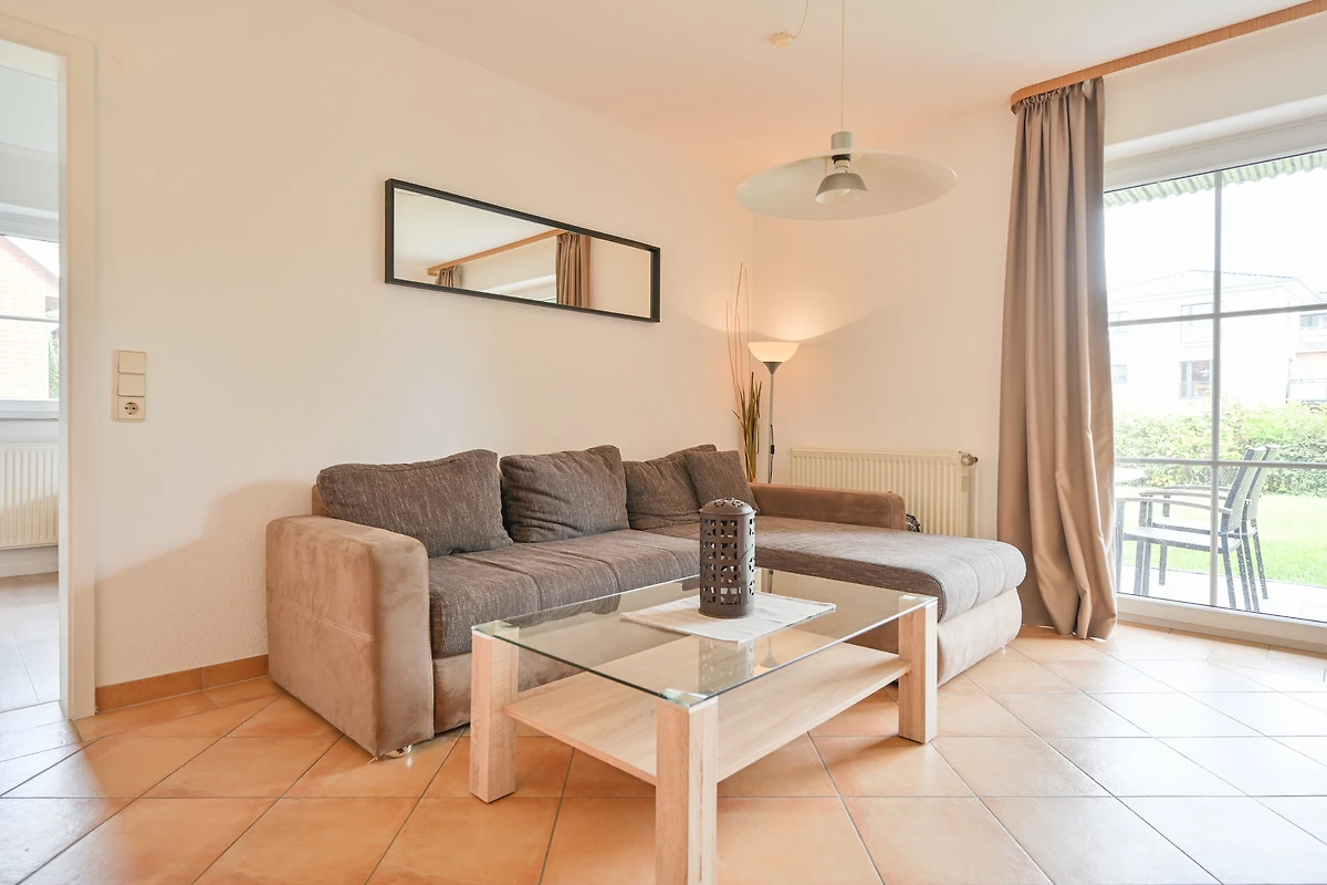 Das Wohnschlafzimmer ist ausgestattet mit einem Schlafsofa für zwei Personen, einem Couchtisch, einem Esstisch mit sechs Stühlen und zwei Vitrinenschränken. Von dem gemütlichen Zimmer aus haben Gäste Zutritt zur möblierten Terrasse, auf der man nach einem erlebnisreichen Tag am Strand noch ein wenig ausspannen kann.