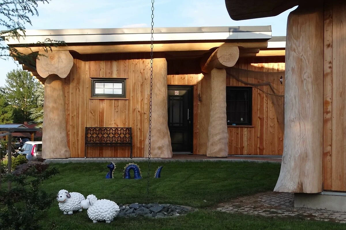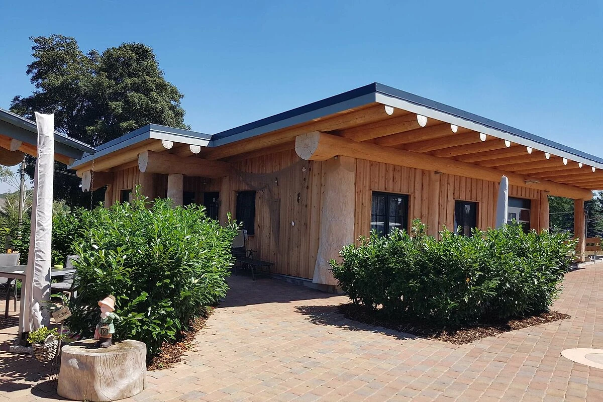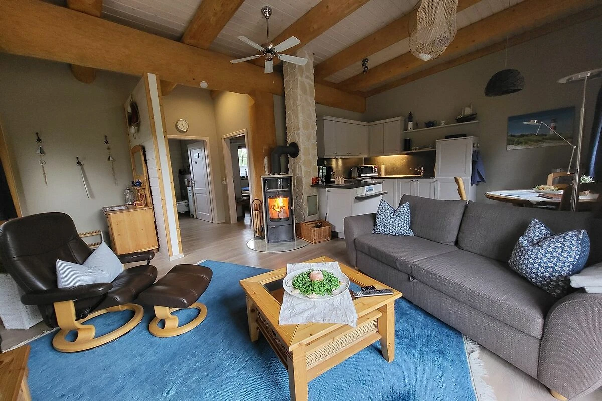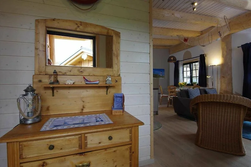 Urlaub im Ferienhaus Fischerhütte aus über 100 Jahre alten Naturstämmen, barrierearm gebaut, mit gemütlicher Einrichtung im maritimen Stil