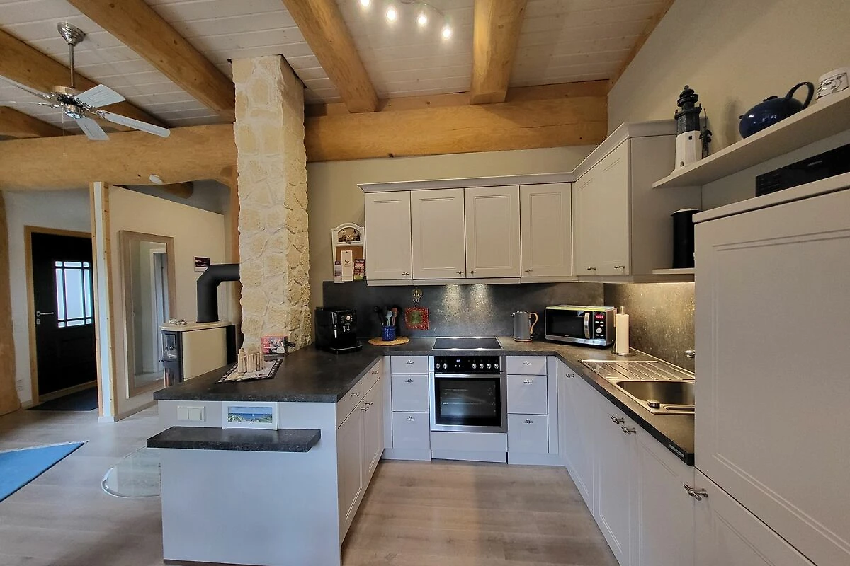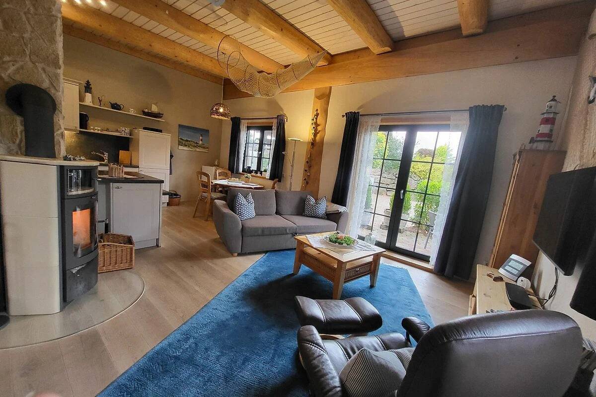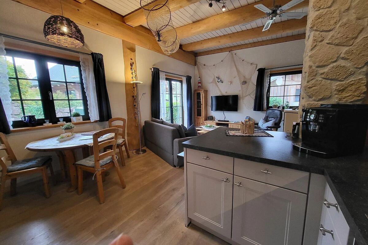 Das Haus verfügt über einen offenen Wohnraum mit Kaminofen, einem hochwertiges Schlafsofa (1,60 x 2,0 m ), 46 Smart TV mit Soundbar sowie einem Esstisch mit Stühlen. Die Nolte Einbauküche ist mit Spülmaschine, Ceranfeld, Dunstabzugshaube, Backofen, Mikrowelle, Kühlschrank mit 0°-Fresh-Safe, einem kleinen Gefrierschrank, Kaffeevollautomat, Toaster und Eierkocher ausgestattet.