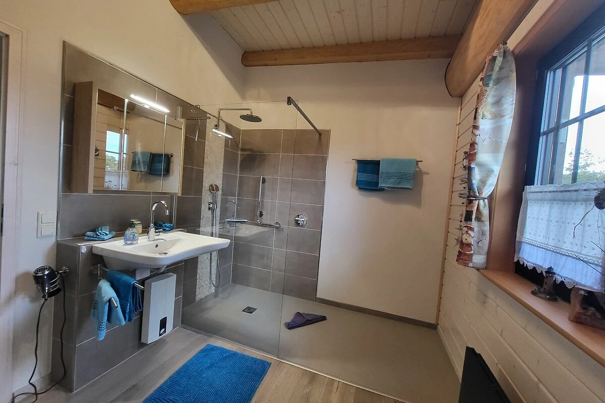 Das grosszügige Badezimmer hat eine Walk-in-Dusche und ein unterfahrbares Waschbecken. Bei Bedarf werden Haltegriffe für Behinderte an der Toilette angebracht.