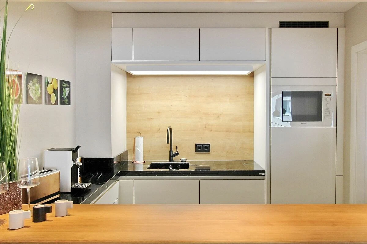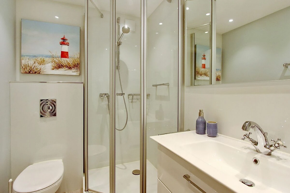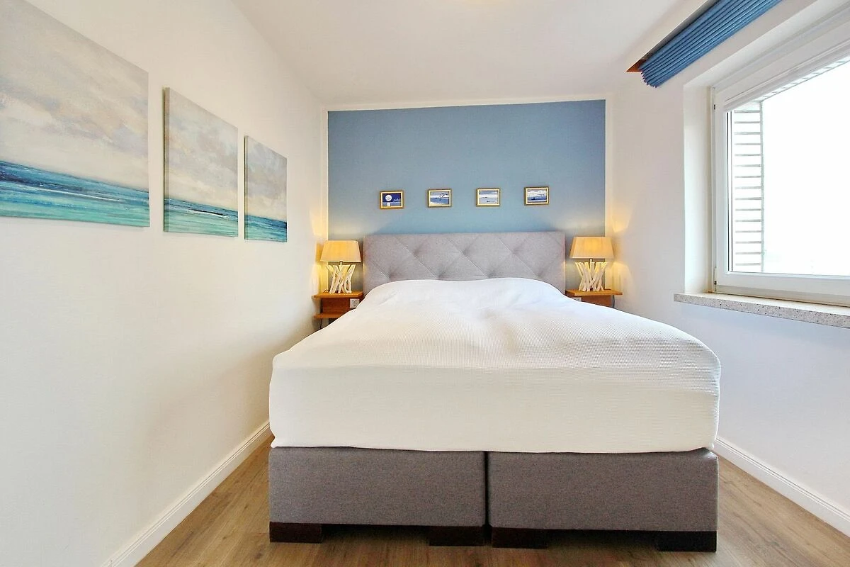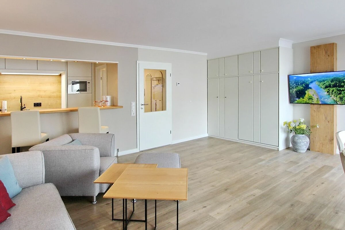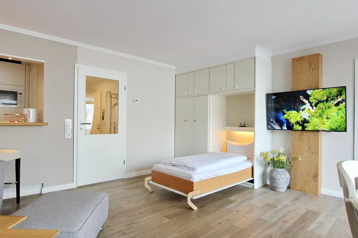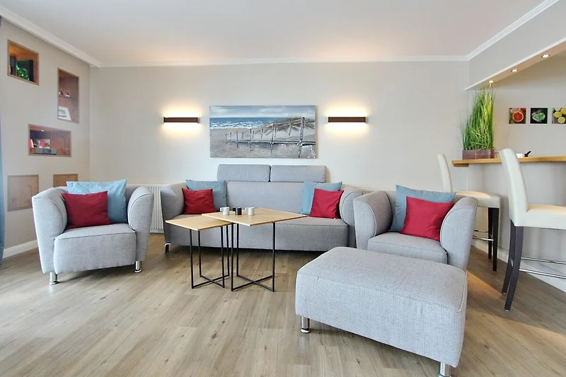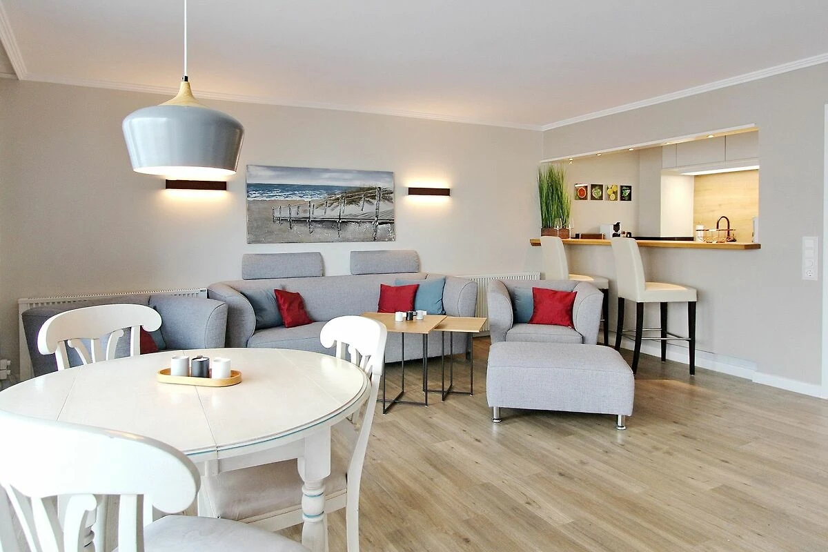 Sehr gemütlich eingerichtete 2-Zimmer-Wohnung im Herzen der Inselmetropole Westerland mit Blick auf die Nordsee - direkt an der Fussgängerzone Strandstrasse gelegen und in unmittelbarer Nähe des Strandübergangs Strandstrasse zur Promenade. Das Appartement im Haus Westerhörn befindet sich in der 3. Etage mit Balkon zur Nordseite - von hier geniessen Sie den Blick die Strandstrasse hoch auf die Nordsee. Der Wohnraum ist mit einer grossen Couchgarnitur mit 2 Sesseln und einem Fusshocker und einem Essplatz mit 3 Stühlen am Fenster und einem Einzelschrankbett ausgestattet. Die Küchenzeile ist im Wohnraum integriert und durch einem offenen Tresen etwas abgeteilt. - hier finden Sie ein Cerankochfeld, eine Mikrowelle und ein Geschirrspüler. Das, vom Wohnraum abgehende, Schlafzimmer verfügt über ein gemütliches Boxspringbett (1,6 m x 2,00 m). Duschbad/WC mit Halbrunddusche. Zur technischen Ausstattung gehört ein Smart-TV und ein Radio. Den kostenfreien WLAN Zugang des Eigentümers können Sie nutzen (die Zugangsdaten finden Sie im App.). Wohnungsgrösse 54 m². Nichtraucherwohnung.