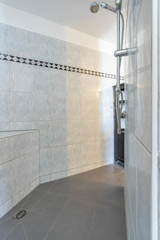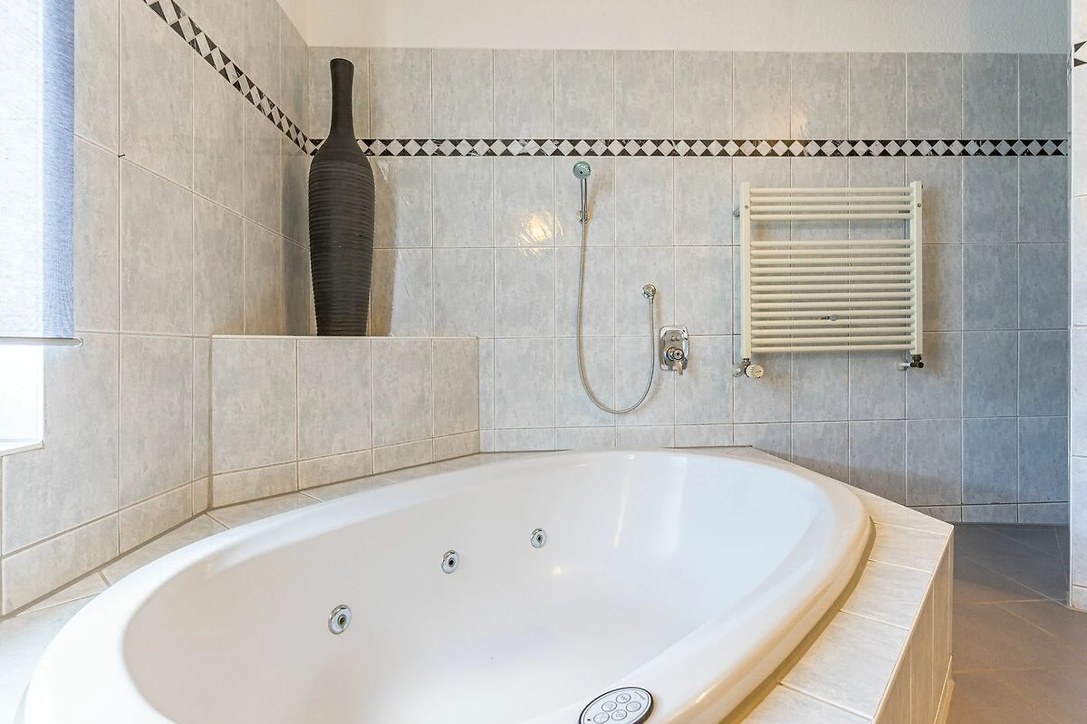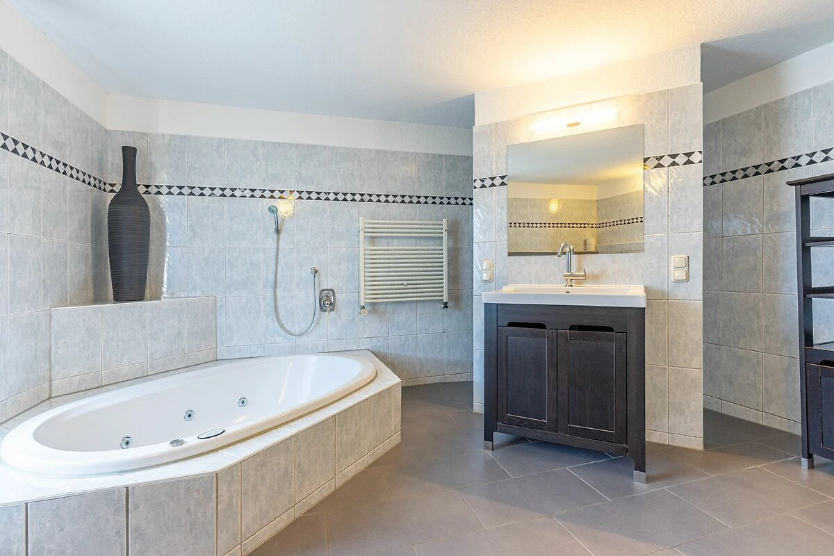 Das geräumige Badezimmer mit Tageslicht verfügt über eine ebenerdige, offene Dusche, über eine große Eckbadewanne mit Whirlpool sowie über ein WC, Urinal, Bidet und einen Waschtisch.