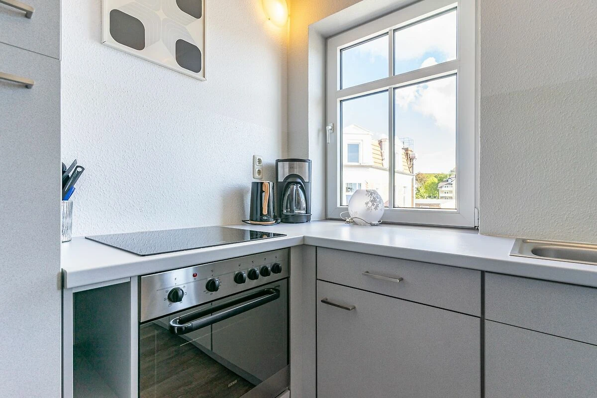 Die helle und moderne Einbauküche bietet neben Cerankochfeld, Backofen, Geschirrspüler, Mikrowelle und Kühlschrank mit Gefriermöglichkeit eine Kaffeemaschine, Toaster und Wasserkocher.