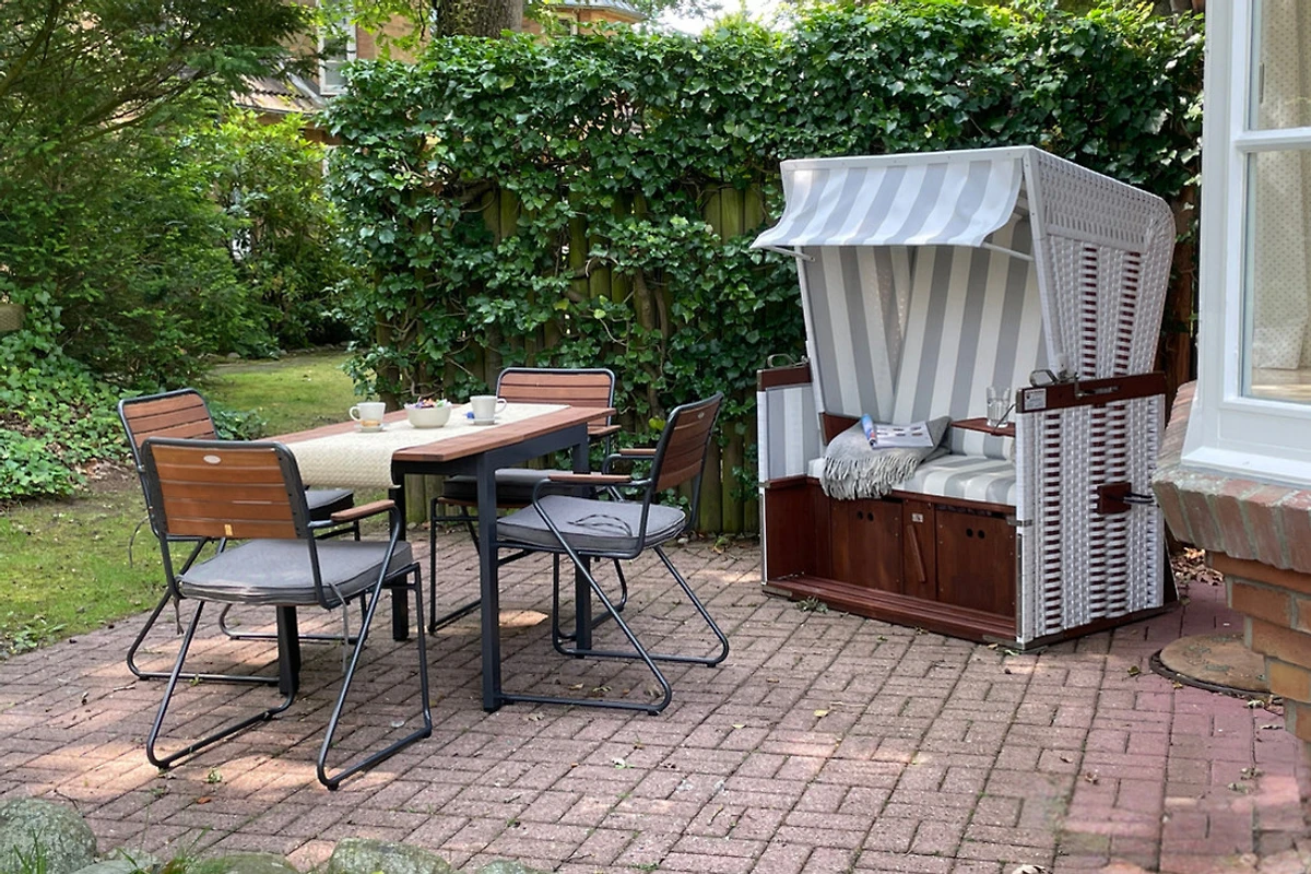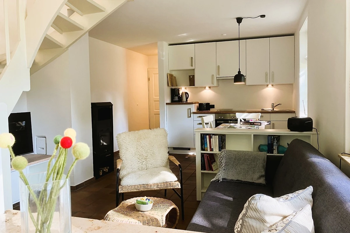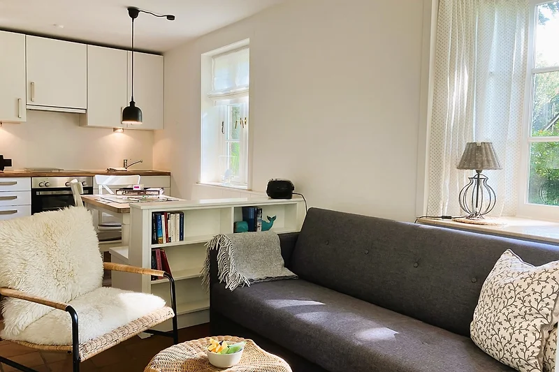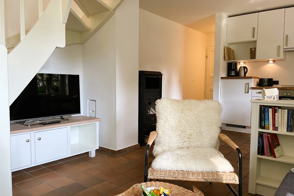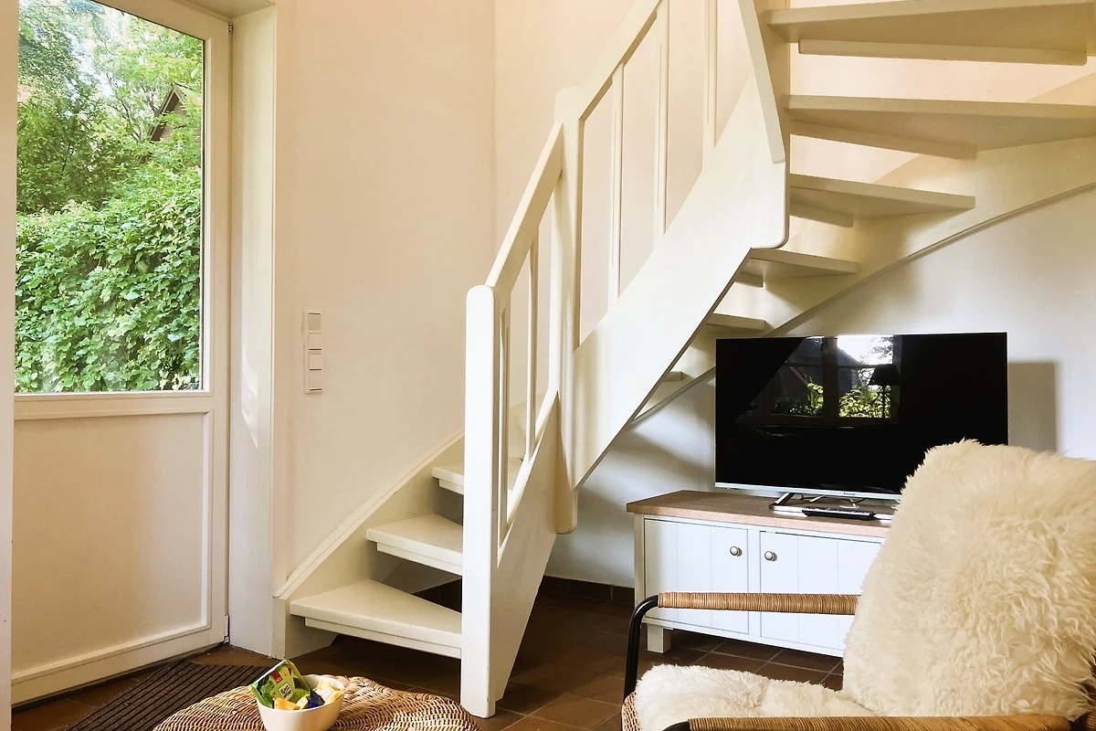 Unser Lütt Strandhus liegt nur wenige Meter entfernt vom beliebten Südstrand mitten im Grünen und erstreckt sich über 2 Etagen. Im Erdgeschoss befindet sich das helle Duschbad mit Fenster sowie der grosszügige Wohnraum mit einer Küchenzeile, einer gemütlichen Essecke am Kamin sowie der bequemen Sitzgarnitur bestehend aus einem Sessel und einer Schlafcouch (110 x 190cm; dient als Ausweichmöglichkeit, wenn Sie getrennt schlafen möchten). Von hier gelangen Sie auf den Terrassensitzplatz und den weitläufigen Garten. Eine Treppe führt Sie in die erste Etage, wo das helle Schlafzimmer mit Doppelbett (180x200cm), Kleiderschrank und einem zweiten Fernseher gemütliche Stunden verspricht. Neben dem Schlafzimmer gibt es hier noch ein zweites kleines Bad mit einer Sitzbadewanne. Die zweite Etage verfügt über einen ausgebauten Dachraum, der zum Abstellen der Koffer dient. Das Lütt Strandhus mit seiner offenen Bauweise und der Fussbodenheizung bietet zwei Personen ausreichend Platz für schöne Urlaubstage auf Föhr. Auf der Terrasse umgeben von der idyllischen Natur wartet ein Strandkorb auf Sie: Inseltypisches Relaxen!