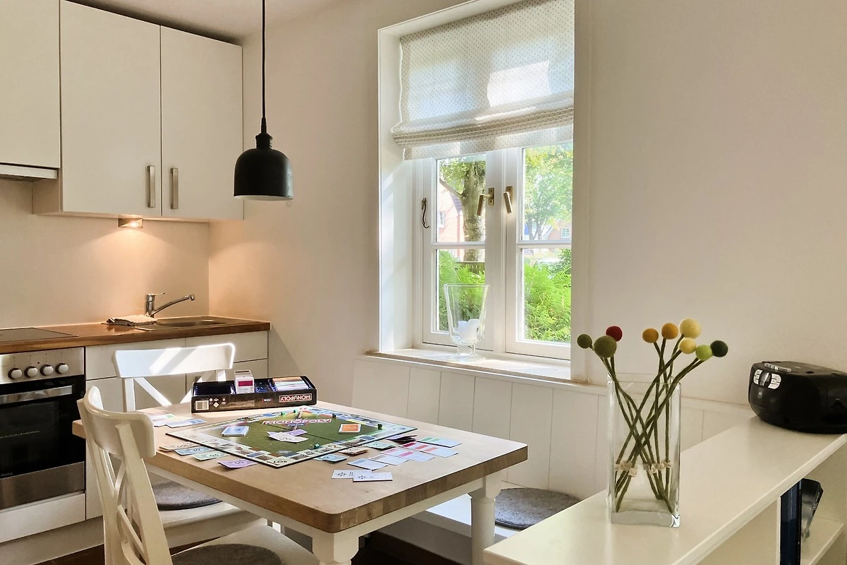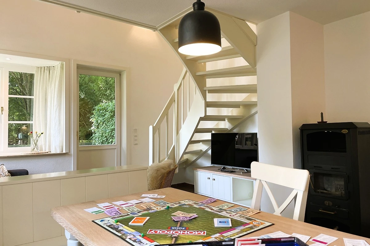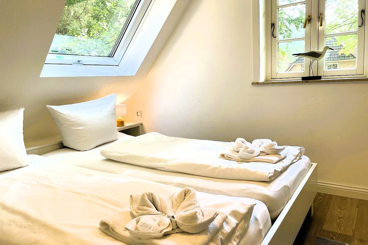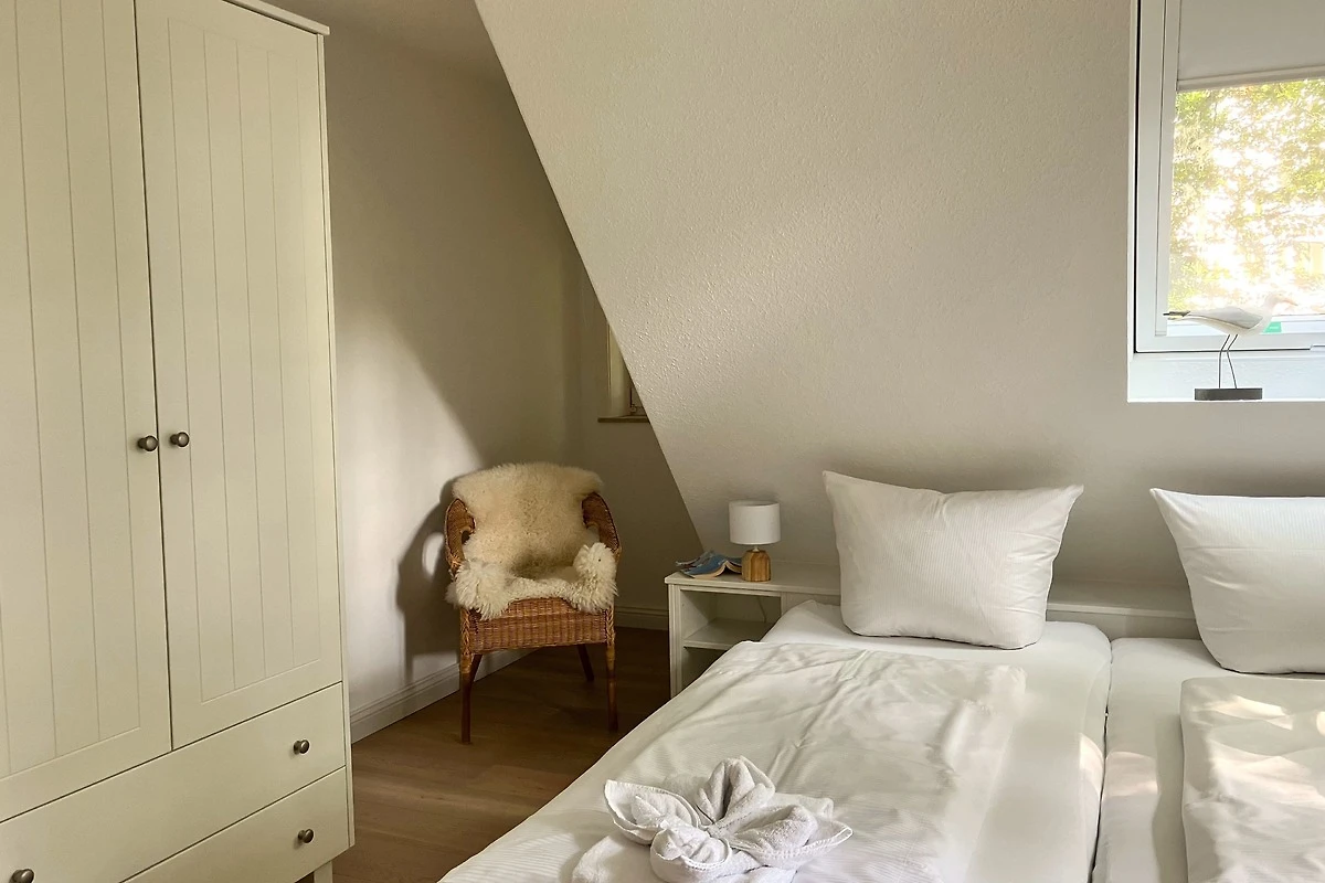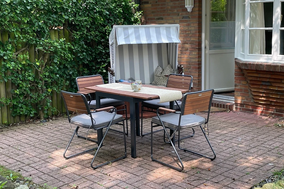 Unser Lütt Strandhus liegt nur wenige Meter entfernt vom beliebten Südstrand mitten im Grünen und erstreckt sich über 2 Etagen. Im Erdgeschoss befindet sich das helle Duschbad mit Fenster sowie der grosszügige Wohnraum mit einer Küchenzeile, einer gemütlichen Essecke am Kamin sowie der bequemen Sitzgarnitur bestehend aus einem Sessel und einer Schlafcouch (110 x 190cm; dient als Ausweichmöglichkeit, wenn Sie getrennt schlafen möchten). Von hier gelangen Sie auf den Terrassensitzplatz und den weitläufigen Garten. Eine Treppe führt Sie in die erste Etage, wo das helle Schlafzimmer mit Doppelbett (180x200cm), Kleiderschrank und einem zweiten Fernseher gemütliche Stunden verspricht. Neben dem Schlafzimmer gibt es hier noch ein zweites kleines Bad mit einer Sitzbadewanne. Die zweite Etage verfügt über einen ausgebauten Dachraum, der zum Abstellen der Koffer dient. Das Lütt Strandhus mit seiner offenen Bauweise und der Fussbodenheizung bietet zwei Personen ausreichend Platz für schöne Urlaubstage auf Föhr. Auf der Terrasse umgeben von der idyllischen Natur wartet ein Strandkorb auf Sie: Inseltypisches Relaxen!