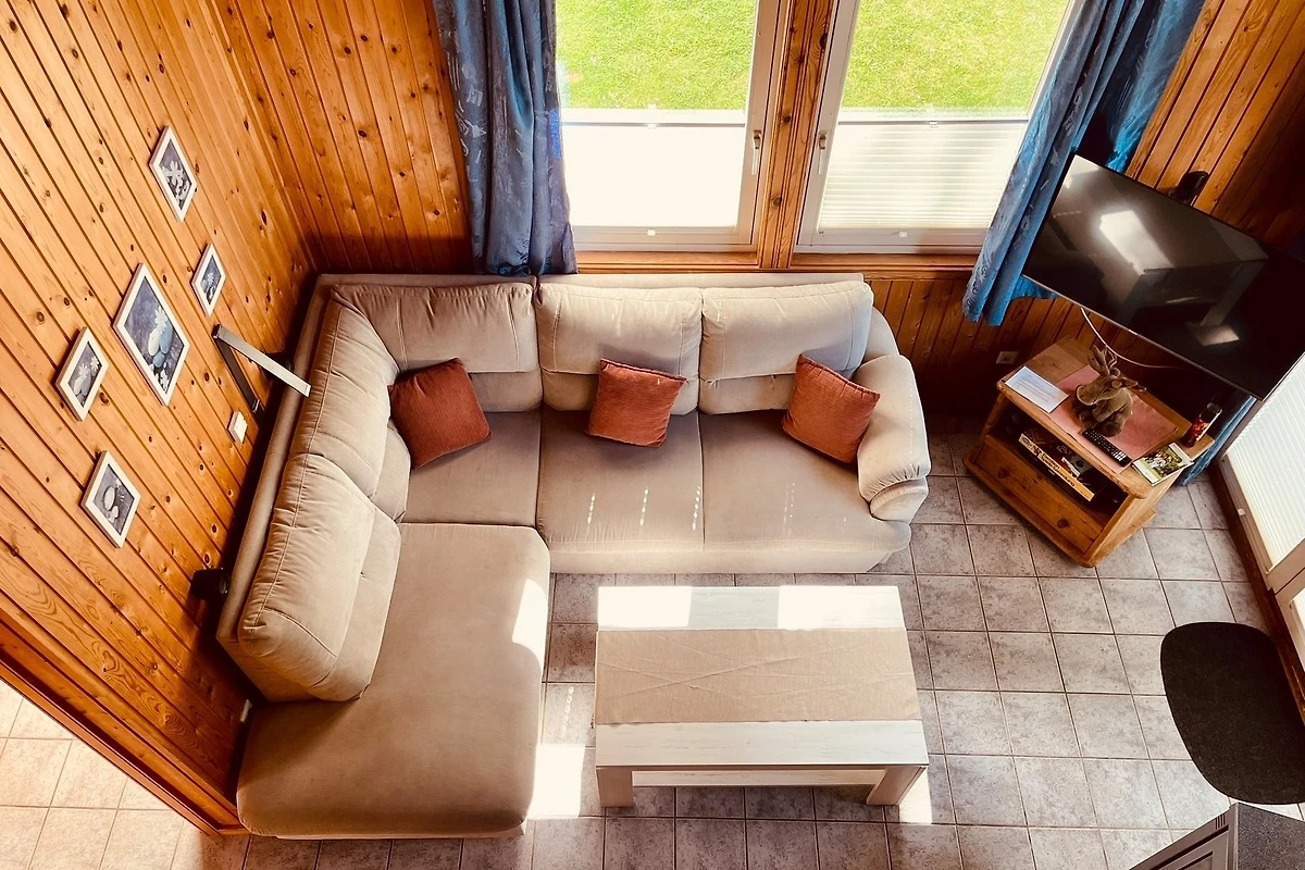 Im Wohnraum befindet sich eine bequeme Sitzlandschaft, ein Essplatz für 5 Personen, sowie ein grosser LCD-TV mit und ein Kaminofen.