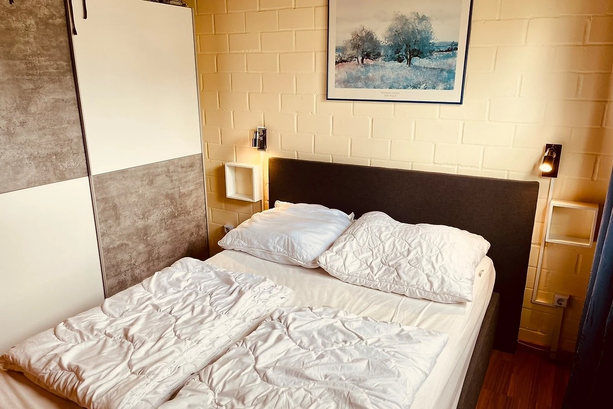 Das an den Wohnraum angrenzende Schlafzimmer ist mit genügend Stauraum ausgestattet.