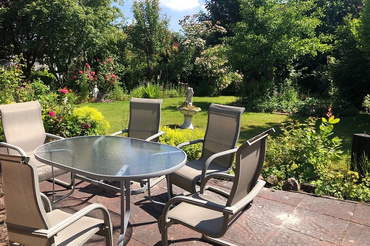 Ein Highlight dieses Bungalows ist die grosszügige Terrasse die von der Küche, dem Wohnzimmer sowie von einem der Schlafzimmer direkt zugänglich ist. Die Terrasse verfügt über einen tollen Strandkorb, eine Sonnenliege sowie einen Kugelgrill die für eine schöne und gemütliche Abendstimmung in einer kleinen grünen Ruheoase sorgen. Ein schön angelegter Garten mit vielen Blumen, Bäumen und grosszügiger Rasenfläche lädt zum Verweilen und Entspannen ein.