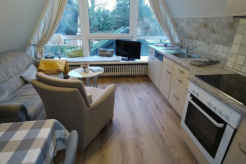 Die gemütliche, 35 m² grosse Obergeschosswohnung in Nieblum bietet Platz für 2 Personen. Das Objekt verfügt über ein Wohnzimmer mit integrierter Küche und einem Essplatz, ein Schlafzimmer mit Doppelbett und ein Duschbad. Man kann sich auch in dem schönen Wintergarten aufhalten, der gemeinschaftlich genutzt wird.