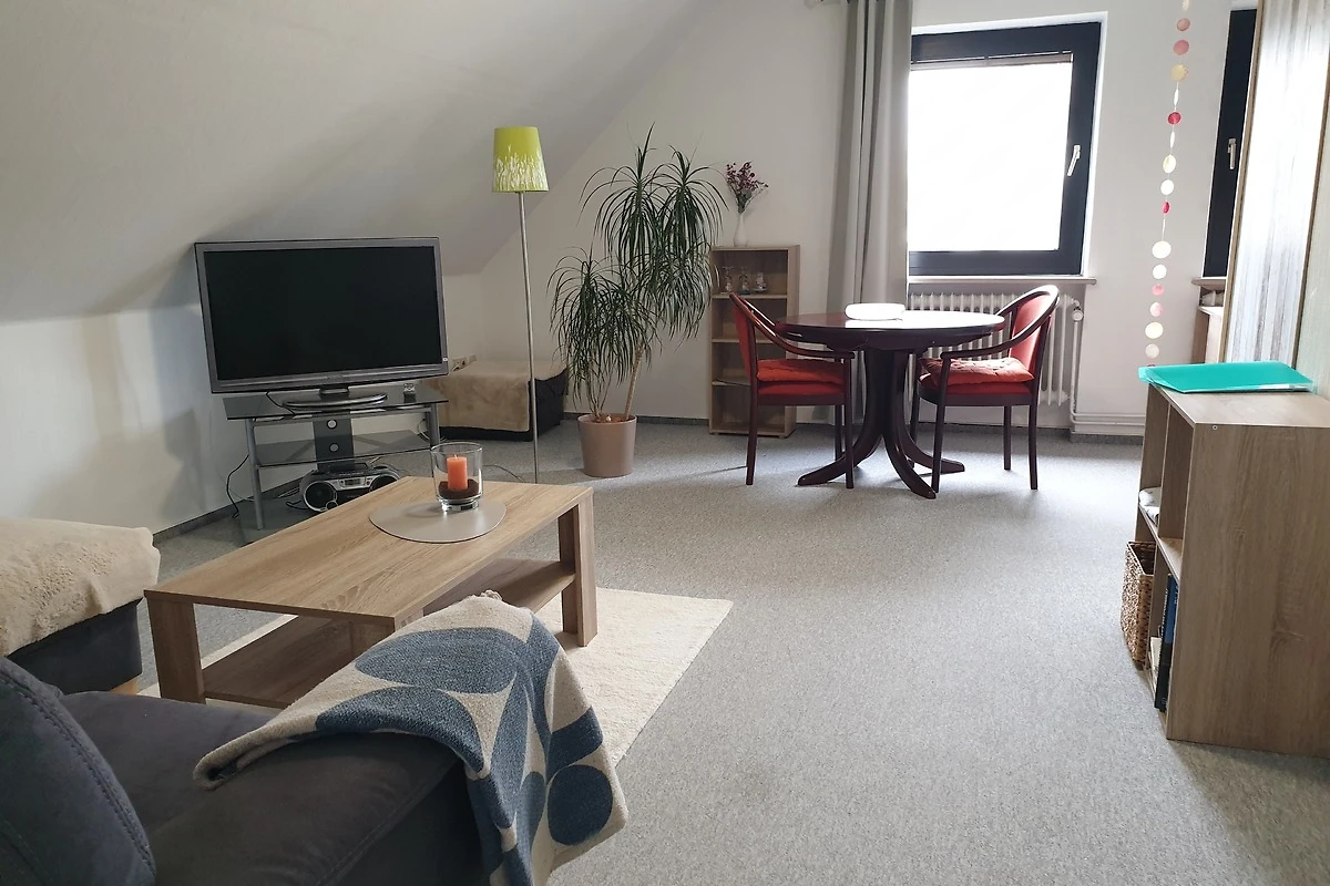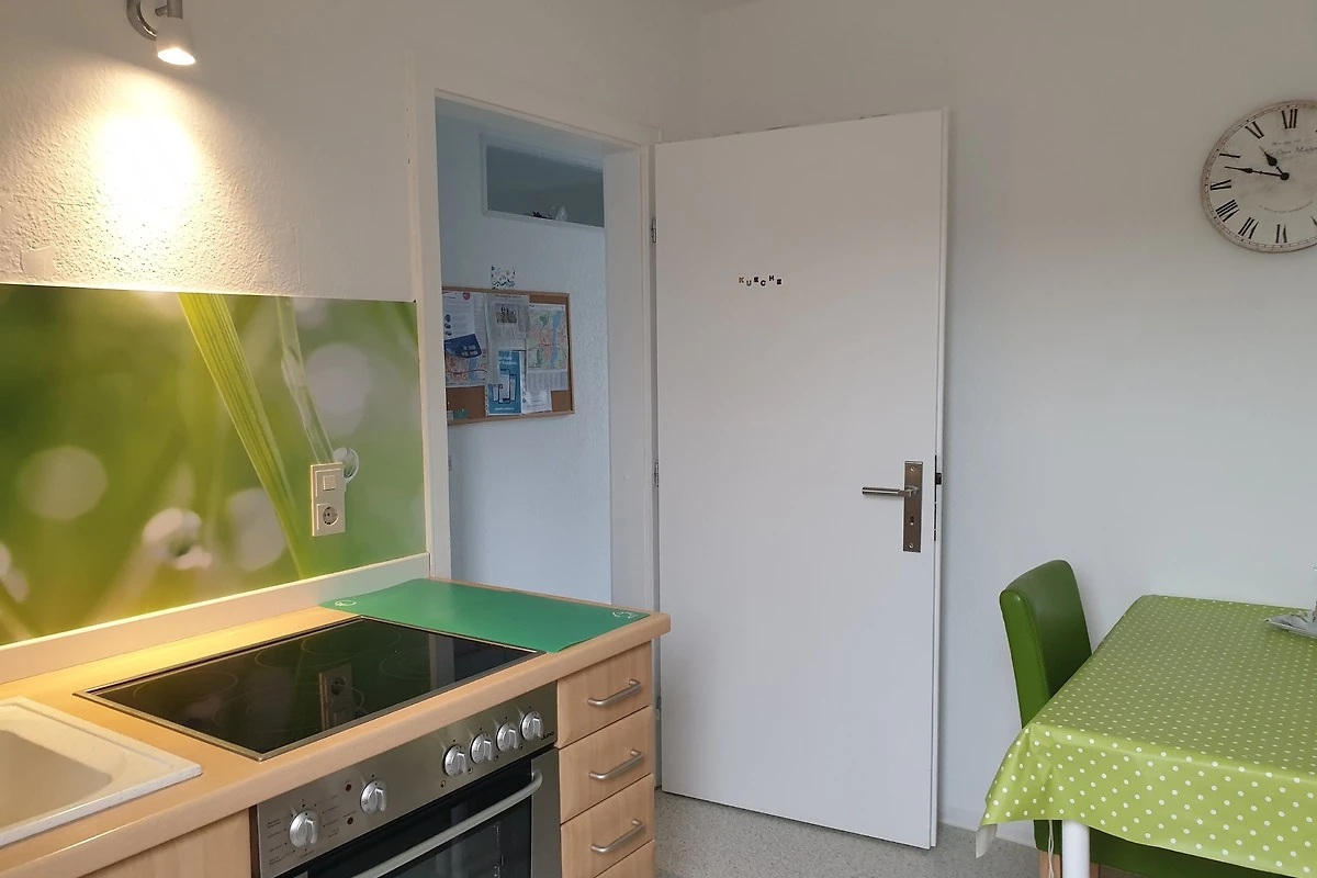 Helle, moderne ca. 46 m² grosse Ferienwohnung in Kappeln. Die Wohnung liegt im Obergeschoss eines Einfamilienhauses. Sie verfügt über einen sonnigen Wohnschlafraum mit zwei Komfort-Einzelbetten und einer bequemen Sitzecke, einem Tisch und Stühlen. Zur Wohnung gehört eine voll ausgestattete Küche mit Essecke, Cerankochfeld, Backofen, Mikrowelle usw. Flur und Duschbad/WC sind natürlich auch vorhanden.