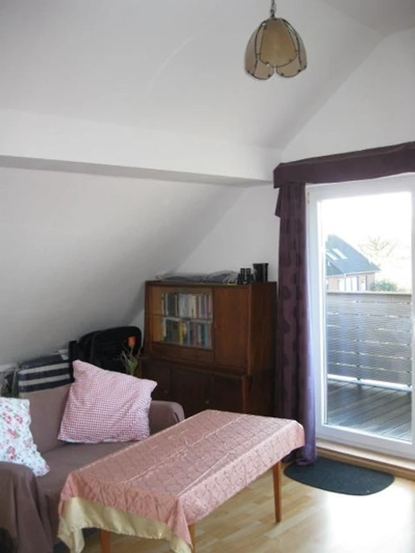 Die Wohnung befindet sich im ERSTEN STOCK und ist über ZWEI ETAGEN verteilt. Sie teilt sich auf in ein Wohnzimmer mit 2 Zweiersofas, Couchtisch, Beistelltisch, Schrank mit Barfach, Fernseher, SAT-Receiver, WLAN, DVD/BlueRay-Player und Stereoanlage. Sowie ein Schlafzimmer mit Doppelbett, Nachtschränken, Kleiderschrank, grossem Spiegel und Sitzgelegenheit. Die Küche ist ausgestattet mit einem Essplatz mit Tisch und 2 Stühlen, Zwei-Platten-Ceranfeld, Mikrowelle, Kühlschrank mit Gefrierfach, Kaffeemaschine, Wasserkocher, Toaster, Eierkocher. Im Bad/WC befindet sich eine Wanne mit Duschabtrennung (hoher Einstieg). Im Dachgeschoss gibt es eine weitere Couch und einen Flat-TV mit DVD-Player sowie einen grossen Balkon mit herrlicher Aussicht auf Schleswig und die Schlei.