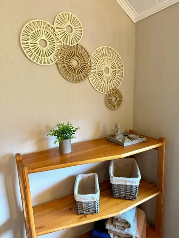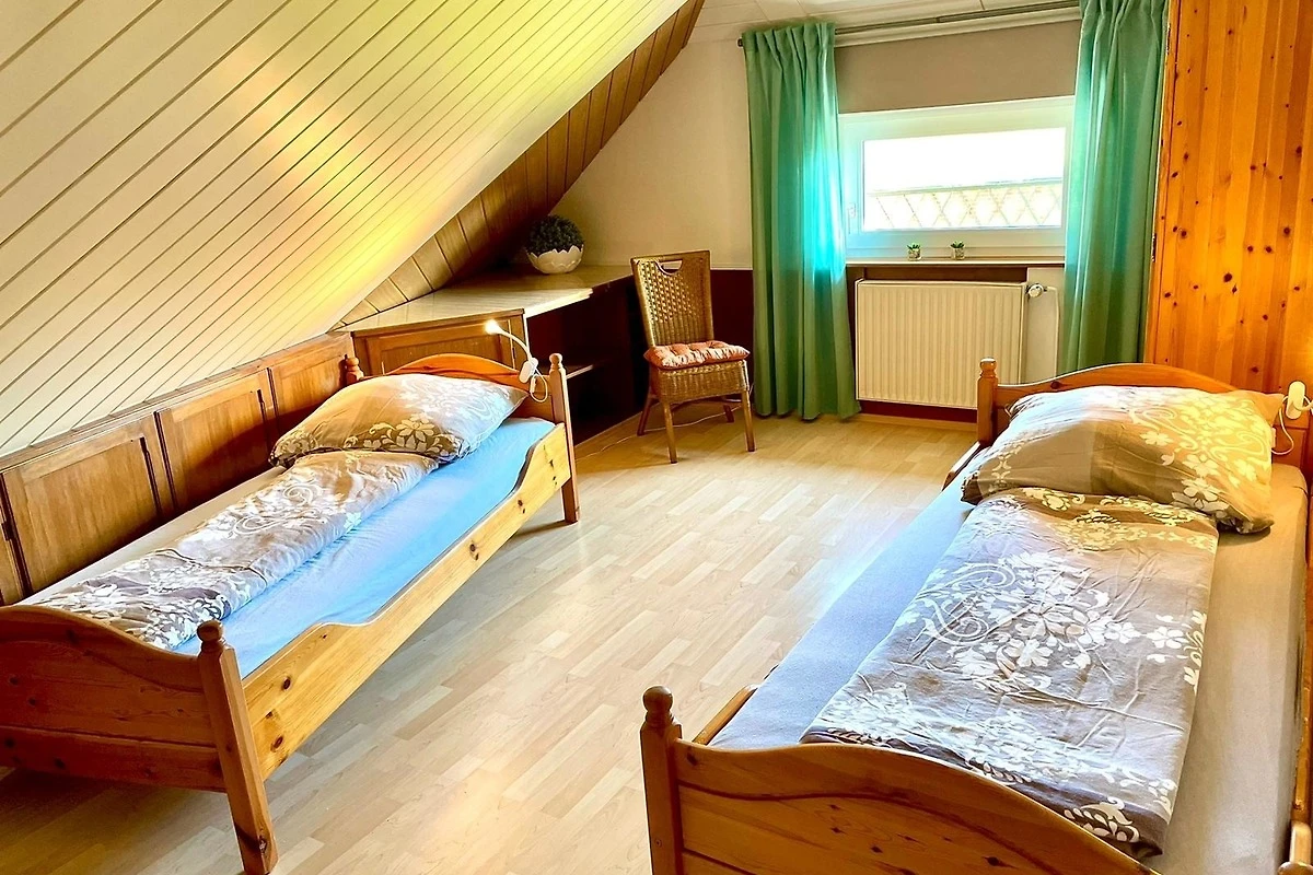 Im Obergeschoss befinden sich ein schönes Vollbad mit Badewanne und Dusche sowie 3 Schlafräume. Zimmer 1: zwei Einzelbetten Zimmer 2: ein Einzelbett und ein Doppelbett (1,40m) Zimmer 3: ein Doppelbett (1,40m)