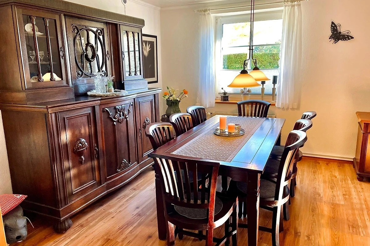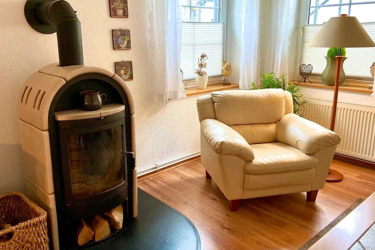 Im Erdgeschoss befindet sich eine voll ausgestattete Küche mit Geschirrspülmaschine, Backofen, Herd, Kühl-Gefrierschrank, Mikrowelle, Toaster, Kaffeemaschine, Wasserkocher und sämtlichem Zubehör. Ein gemütliches Wohn- und Esszimmer mit Kaminofen lädt zum Entspannen ein (TV-Flachbild, Gesellschaftsspiele und Lesebücher stehen zur Verfügung), desweiteren befinden sich im EG ein kleines Gäste-WC und ein grosser Hauswirtschaftsraum mit Zugang zur 16 qm grossen, überdachten Terrasse. Im HWR steht für Sie eine Waschmaschine und ein Wäschetrockner zur Verfügung, der vorhandene Kickertisch darf gerne von Ihnen benutzt werden. Es steht ein Kinderhochstuhl und ein Kinderreisebett zur Verfügung (Bettwäsche ist hierfür selbst mitzubringen).