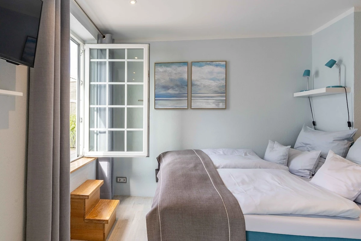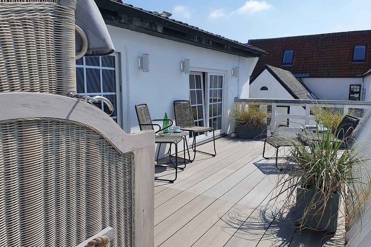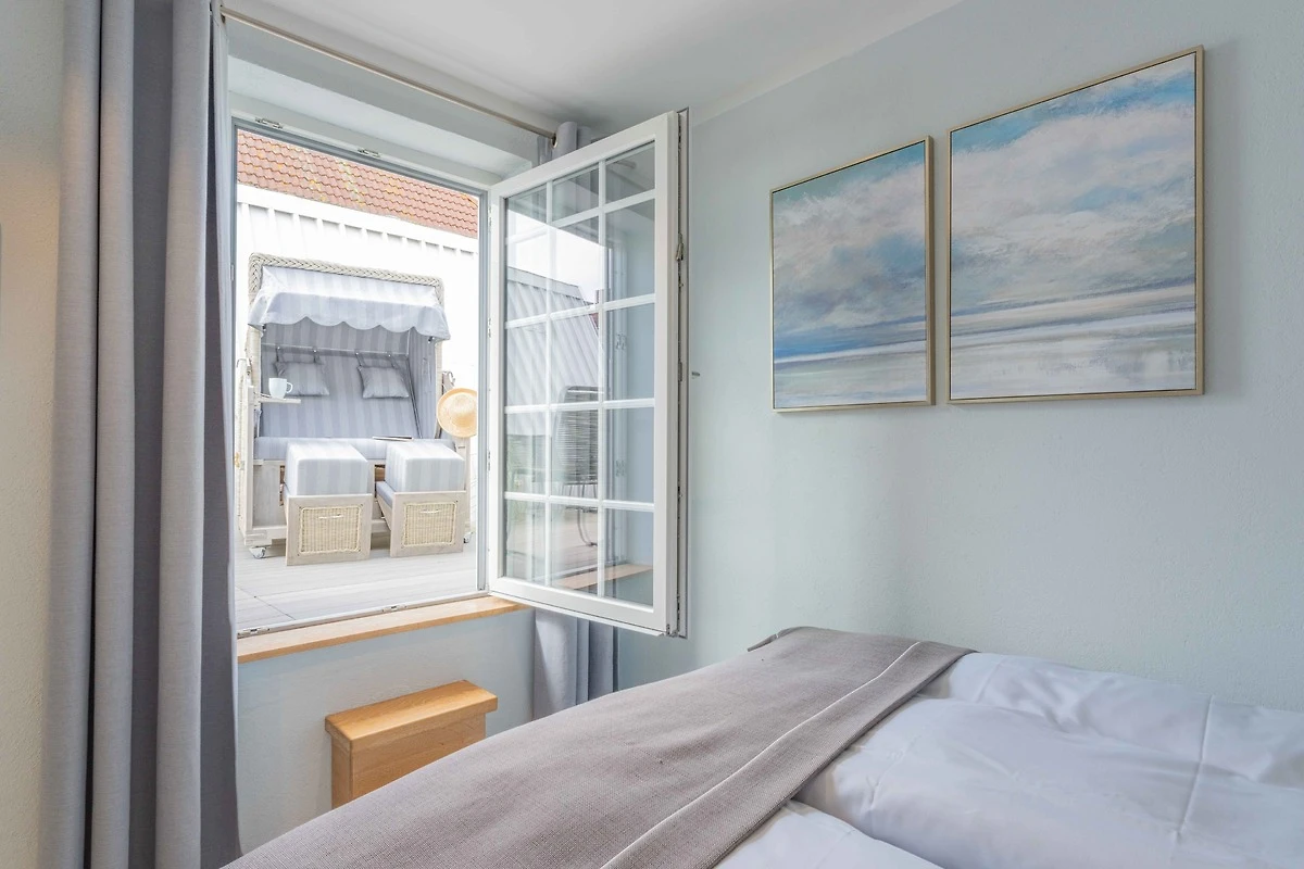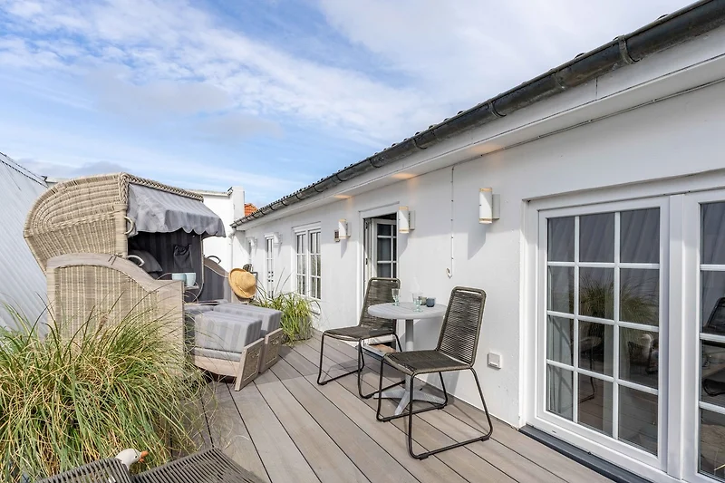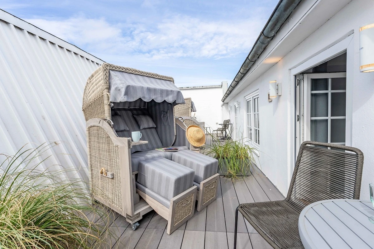 Auf 4 Sterne-Niveau und im norddeutschen Design wurde ein schönes und neues Apartment auf 47 m2 eingerichtet. 18 m2 davon gehören zu einer eigenen Dachterrasse. Das Apartment besitzt ein neues Bad mit WC, Dusche mit bodennahem Eintritt, einem Waschbecken mit Ablage, Wandhaken und Ablagefläche für Kosmetikutensilien. Ausserdem stehen je 2 Handtücher, 2 Duschtücher sowie 2 Bademäntel, eine Badematte sowie ein Föhn zur Verfügung. Im Wohnbereich befinden sich am Eingang eine Garderobe und ein Ganzkörperspiegel. Die Pantryküche besteht aus Kühlschrank, Kochceranfeld, Mikrowelle und Kaffeemaschine, Toaster und Wasserkocher. Zur weiteren Ausstattung gehören Esstisch, Wandklapptisch, 2 komfortable Sesselstühle, ein HD TV und WLAN, ein Boxspringbett (1,60x2,00m) mit Superiortopper und zwei Leselampen + Ablage im Schlafbereich. Das Highlight ist eine eigene Dachterrasse, auf der man sich "weit weg vom Alltag - nur den Wolken und Möwen ganz nah" fühlt. Hier stehen Strandkorb, Lounge Chair und eine Essecke bereit. Im Innenhof mit mehreren Sitzecken warten zudem Strandkorb und Grill. Eine sichere abschliessbare Fahrradunterstellmöglichkeit ist vorhanden. Parkgarage nach Verfügbarkeit.