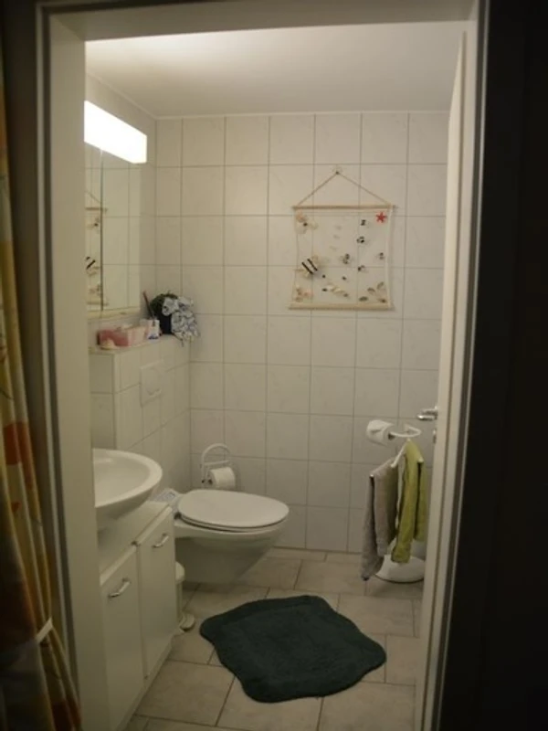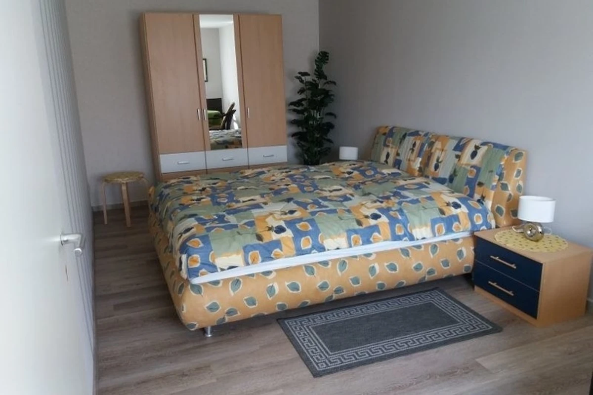 Sie besteht aus einem Wohnzimmer und einem Schlafzimmer mit Doppelbett. In der gemütlichen Wohnküche gibt es einen Backofen und eine Mikrowelle. Das Badezimmer verfügt über Waschbecken und WC, die Dusche befindet sich in einem abgetrennten Raum.