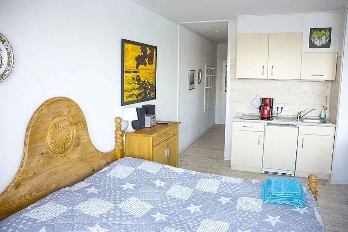 Bei der Wohnung Nr. 3 im 10. Stock handelt es sich um ein helles und voll ausgestattetes 1-Zimmer-Apartment mit Balkon. Der Wohnraum ist mit freundlichen Möbeln überwiegend aus hellem Holz ausgestattet, es gibt einen Flachbildfernseher, WiFi, eine Stereoanlage sowie schöne Bilder und Dekoration. Geschirr, Besteck, Töpfe und Pfannen sind in der Küchenzeile vorhanden. Der Herd hat zwei Cerankochfelder und es gibt eine Mikrowelle mit Grillfunktion. Vom Balkon, dessen Fensterscheiben zur Seite geschoben werden können, blickt man auf die Innenstadt und den Dom, den Stadthafen, die Möweninsel und die Schlei. Einen ähnlich schönen Ausblick hat man auch vom Wohnraum aus. Bestens geeignet, um von hier aus Schleswig und Umgebung zu erkunden. Ausser zum Apartment selbst besteht für diejenigen Gäste, die Wäsche waschen wollen, im Keller Zugang zu Waschmaschine und Trockner. Einzelheiten insbesondere zu den erforderlichen Münzen, aber auch zu wichtigen Ausflugszielen und mehr können in der Willkommensmappe nachgelesen werden. Ferner kann man im Erdgeschoss den Durchgang zum Fahrstuhl nehmen, der ganz nach oben zur "Bar 26" im Wikingturm führt. Netzwerkname und Passwort finden sich in der Mappe und in der Kommodenschublade.