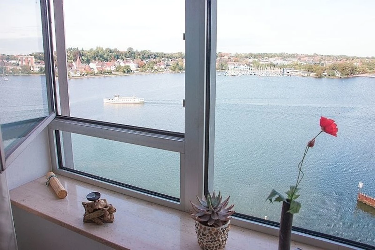 traumhafter Blick aus 10. Stock auf Schlei, Wohnung gemütlich + praktisch eingerichtet, haben uns echt wohlgefühlt, gute ÖPNV-Anbindung für Ausflüge in die Umgebung