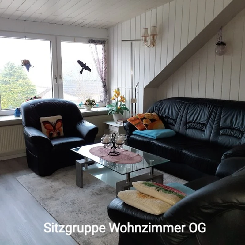 Die liebevoll eingerichtete Ferienwohnung liegt im Obergeschoss eines ruhigen Einfamilienhauses mit Terrasse, Garten, Teich mit Fischbesatz und Blockhütte (Aufenthaltsort für Gäste).