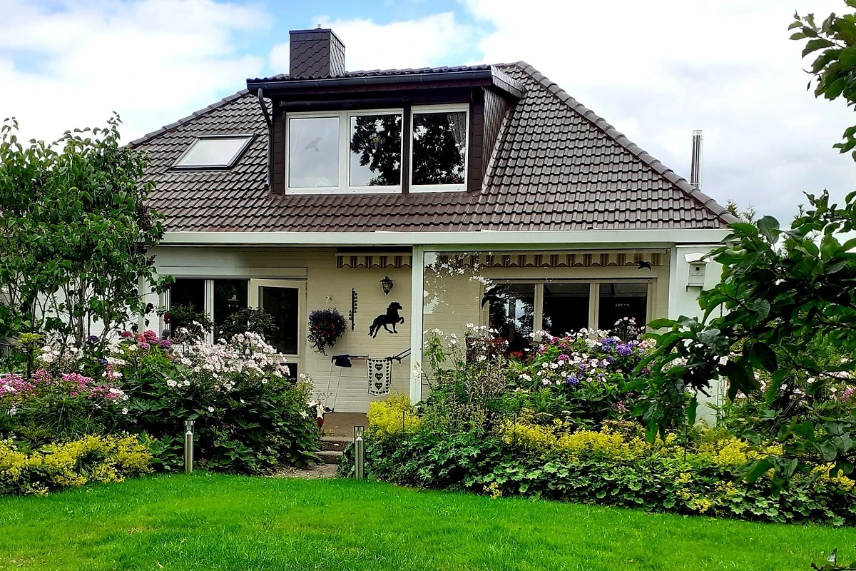 Ruhiges Einfamilienhaus in Fahrdorf mit Garten, Teich und Blockhütte. Die Ferienwohnung liegt im Obergeschoss. Einen Autoabstellplatz bietet der hauseigene Parkplatz. Unterstellplatz für mitgebrachte Fahrräder ist ebenfalls vorhanden. Hauseigene Fahrräder stehen kostenlos zur Verfügung.