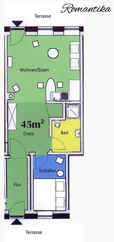 Im Sommer 2012 wurden im ehemaligen Pferdestall des Guts drei moderne, individuelle und liebevoll ausgestattete Premium-Ferienwohnungen eingerichtet. Diese Ferienwohnungen befinden sich in einem Gebäude, das in Einzellage direkt oberhalb des mit Seerosen bewachsenen Gartenteiches liegt. Von dort aus schweift der Blick über den Teich in den Guts-Park mit majestätischen, alten Bäumen, in den Buchenhain und weiter über die Felder. Ein magischer Sitz- und Grillplatz im Buchenwald und ein Steinlabyrinth geben Ihnen ein Gefühl von Frieden und 'angekommen sein'. Alle Ferienwohnungen sind hochwertig ausgestattet mit Internet über WLAN, Satellitenfernsehen und einer Stereokompaktanlage. Die Wohnung 'Romantika' ist 45 m2 gross und eine bezaubernde Unterkunft für bis zu 2 Personen. Eine gemütliche Wohnküche mit Essecke und ein Ausziehsofa vor dem Kamin laden zu kuscheligen Stunden vor loderndem Kaminfeuer ein. Die romantische Atmosphäre wird unterstrichen durch das harmonische Zusammenspiel von zarten Flieder- und Rosétönen mit hochwertigen floralen Stoffen. Einzigartig ist das märchenhafte Doppel-Alkoven-Bett mit Blick in den Sternenhimmel, der einem hilft, in sanfte Träume zu verfallen. Das in weiss gehaltene Badezimmer mit ebenerdiger Duschkabine vollendet das harmonische Ambiente. Zwei Terrassen ermöglichen dem Gast, mit dem Lauf der Sonne den Tag zu beginnen und zu beenden.