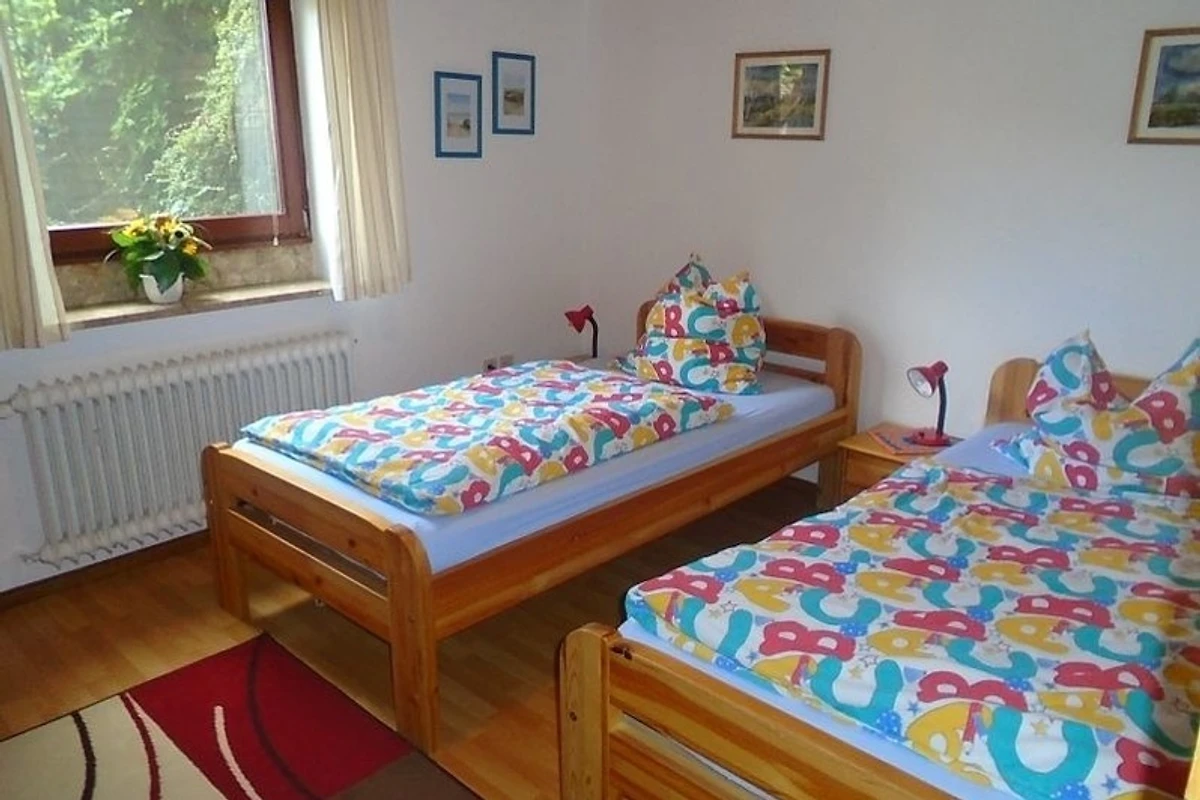 66 qm grosse, helle Ferienwohnung im Souterrain in ruhiger Lage (Sackgasse). Wohnraum mit Essecke, 2 Schlafräume, sep. Küche mit Mikrowelle, DU/WC.
