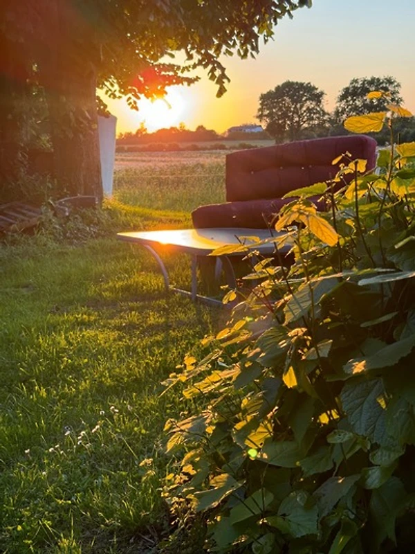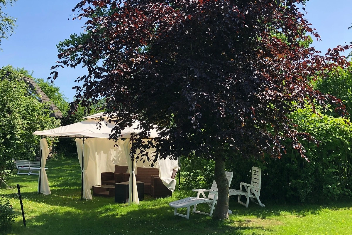 Ruhige Ferienwohnung inmitten der grünen Felder mit grossem Garten, Tischtennisplatte, Basketballkorb, einem Aussenkamin, Sitzplatz am Teich sowie einer gemütlichen Laube.