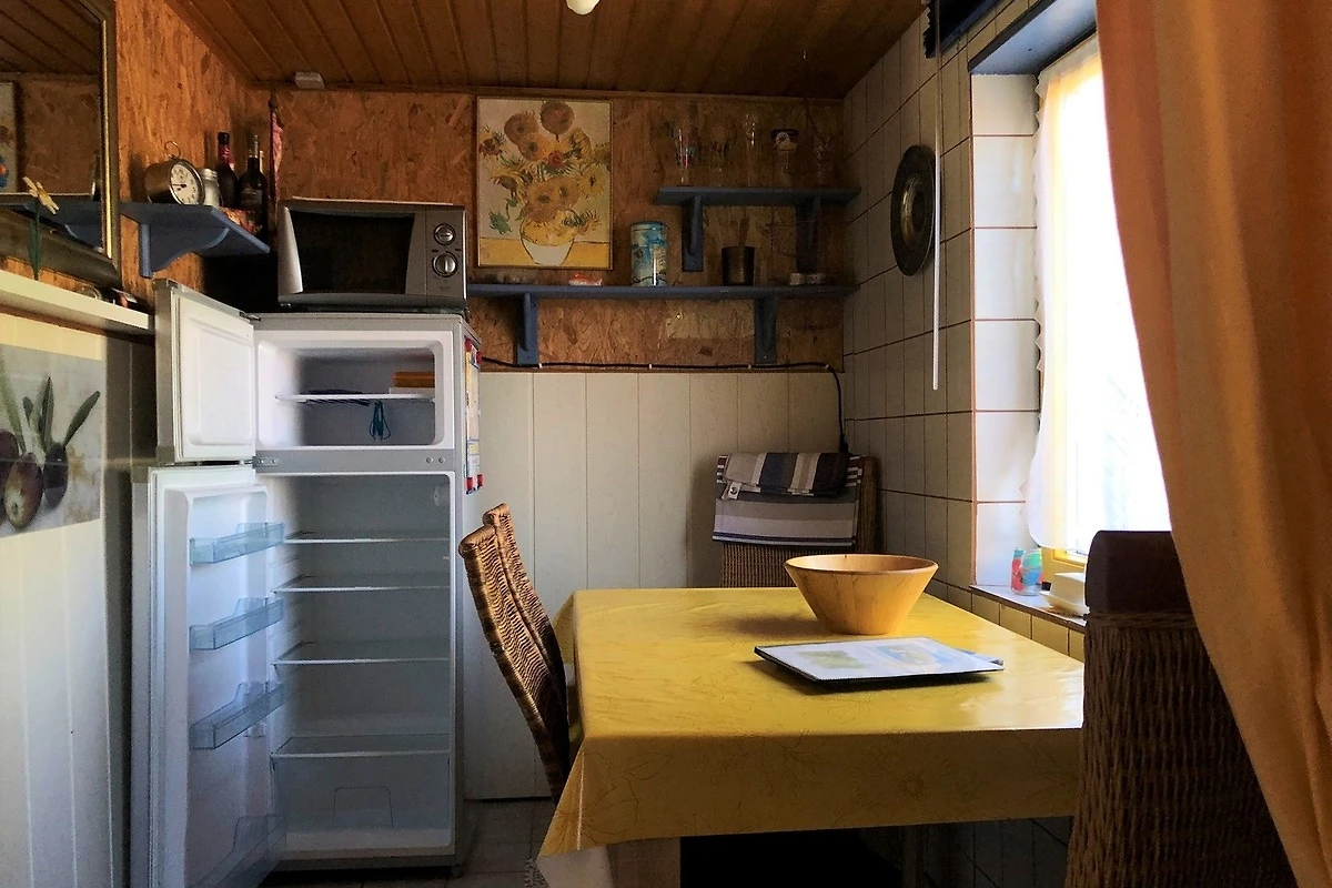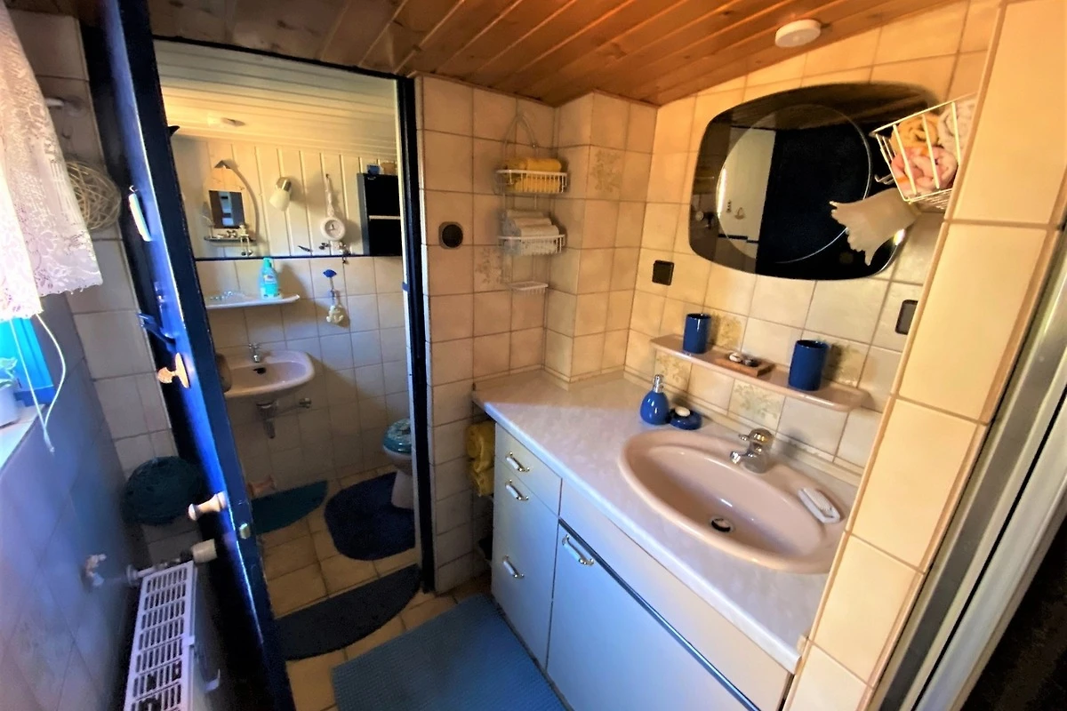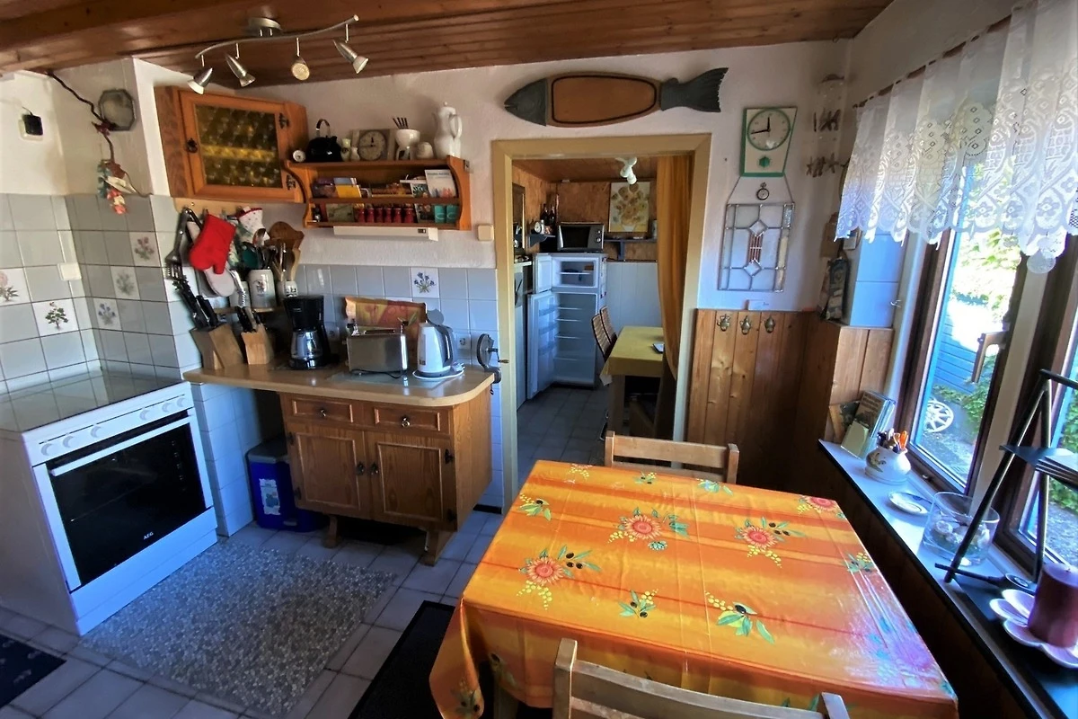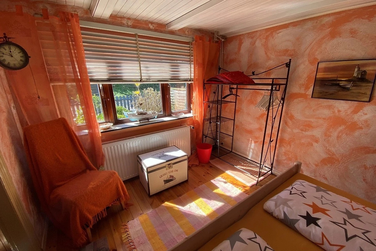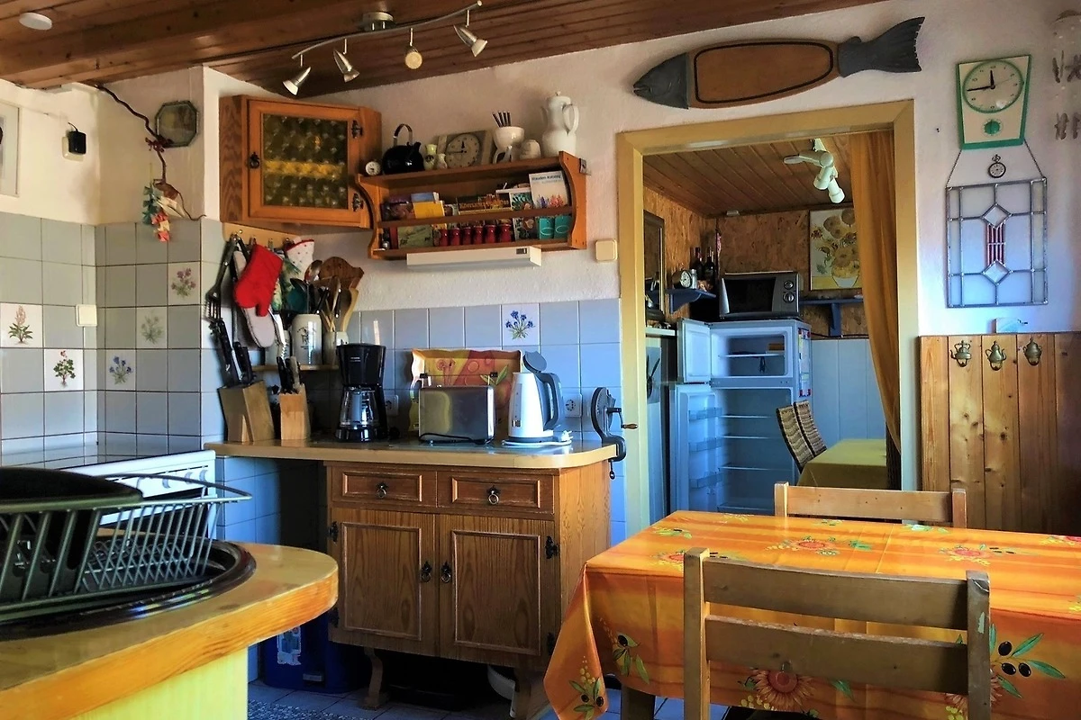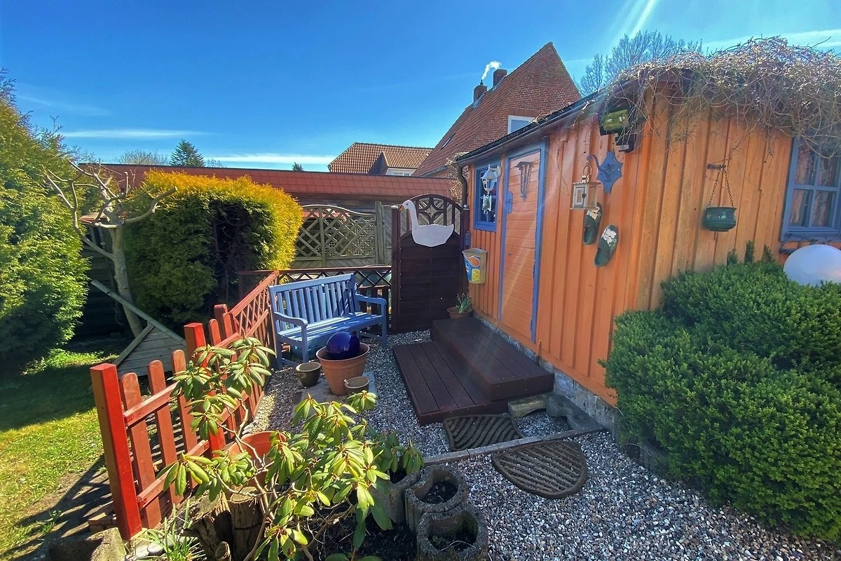 Auf Anfrage kann das Gartenhaus mitbenutzt werden. Hier befindet sich ein weiteres Badezimmer mit Dusche und WC sowie eine kleine Teeküche mit Herd, Kühlschrank, Spüle.