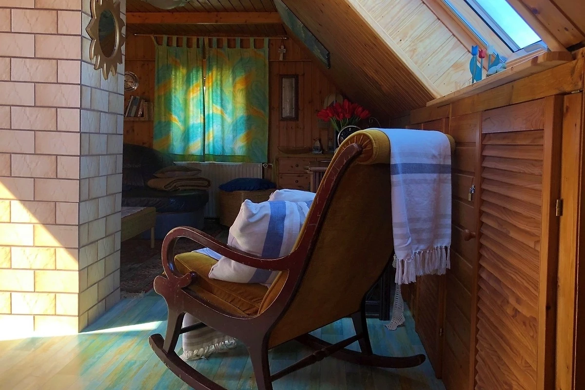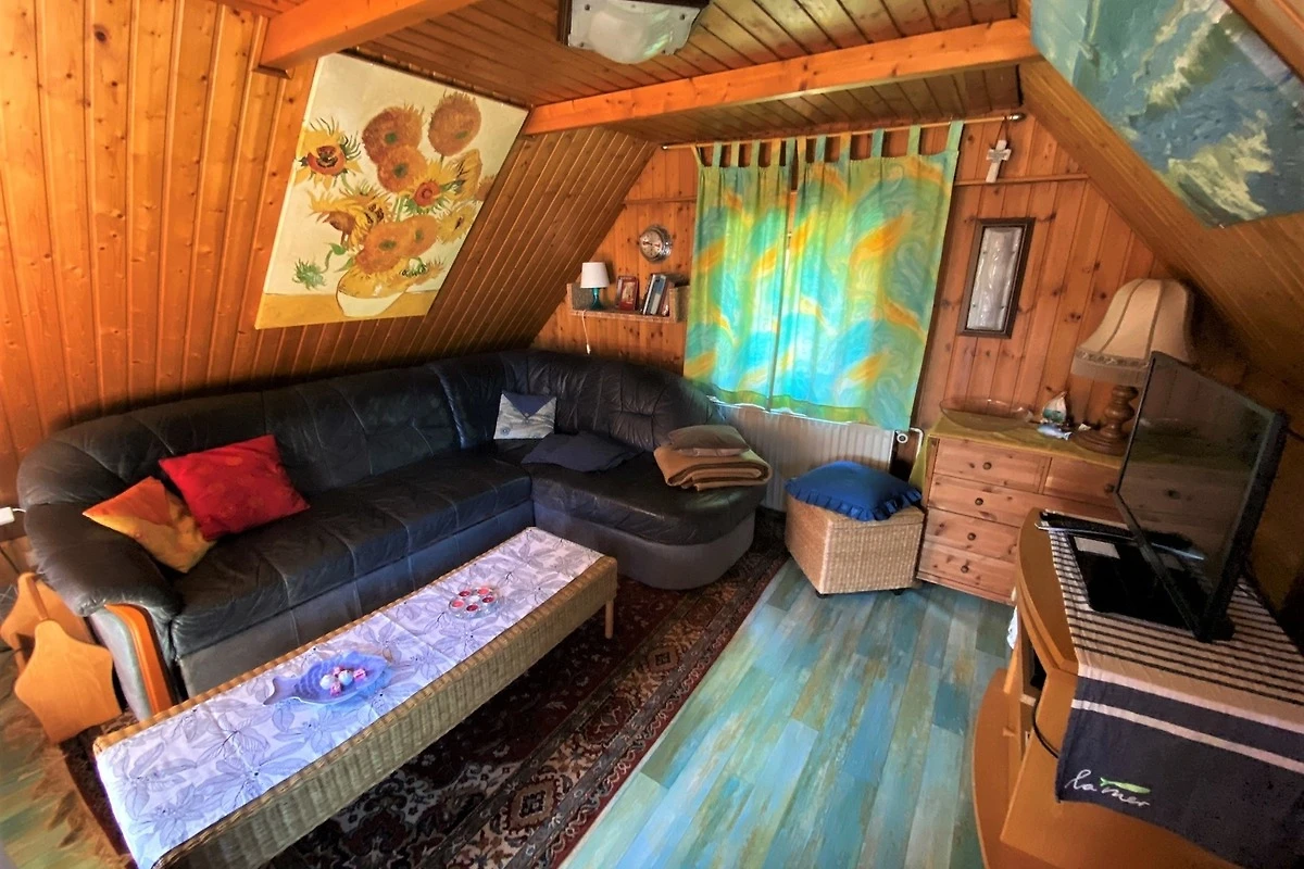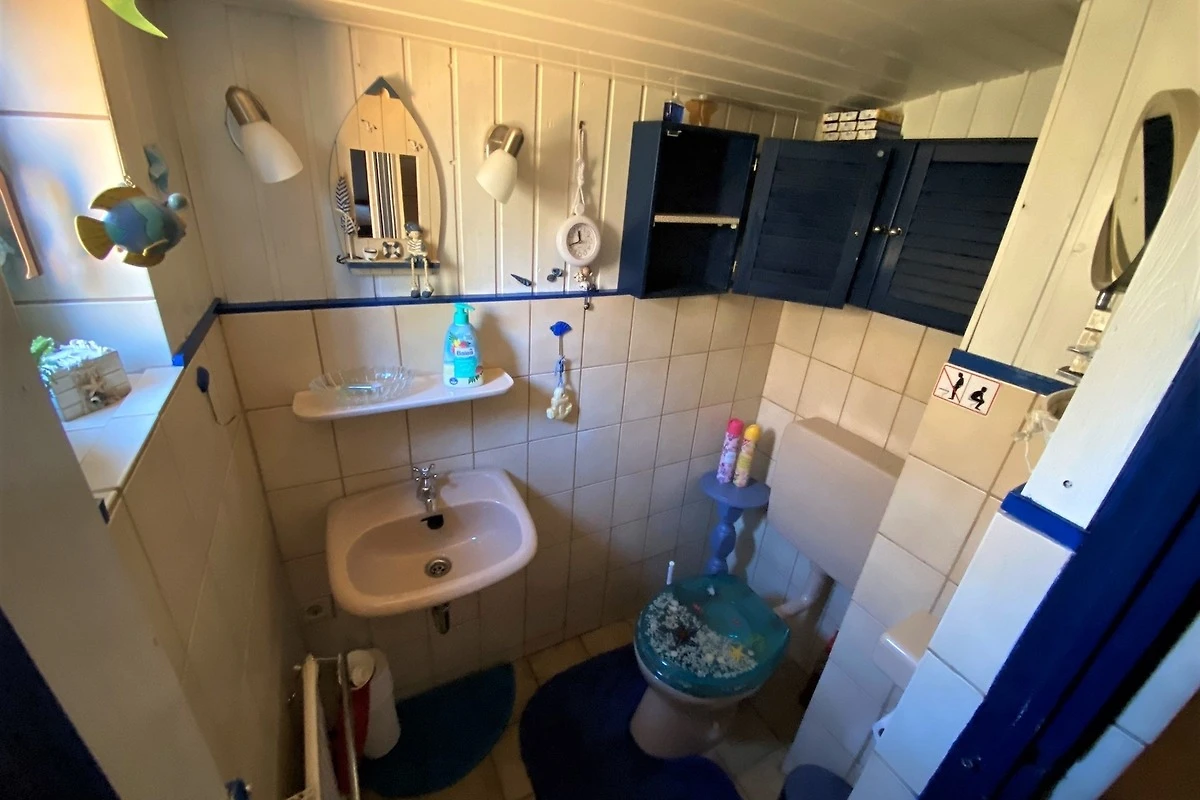 Im Erdgeschoss befinden sich zwei Schlafräume mit jeweils einem Doppelbett, eine Küche mit Mikrowelle und das Esszimmer. Eine Dusche ist ebenso vorhanden wie ein separates WC. Im Obergeschoss liegt das Wohnzimmer mit SAT-Anlage und einem angrenzenden Balkon.