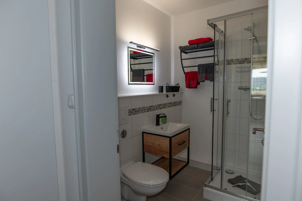 Geniessen Sie eine entspannte Dusche im Badezimmer mit Waschtisch und WC. Sie finden Föhn, Kosmetikspiegel sowie Hygieneartikel vor.