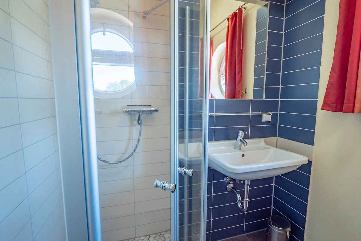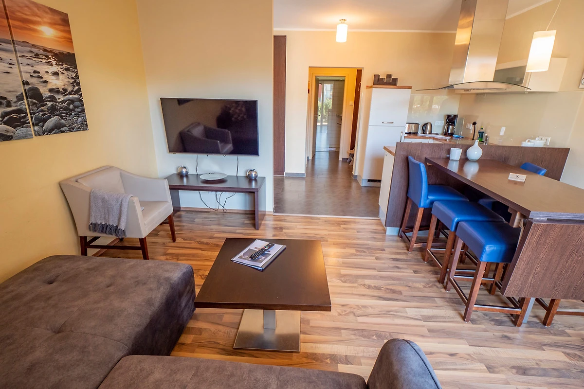 Die Wohnungen Müritz verfügen über zwei Doppelschlafzimmer mit jeweils eigenem Duschbad. Das Sofa im Wohnbereich lässt sich zu einem Doppelbett für zwei weitere Personen umbauen.