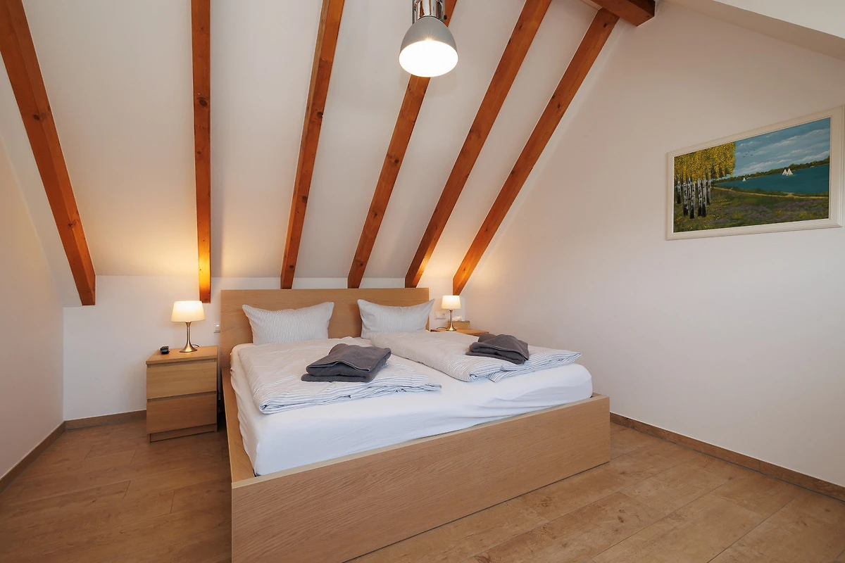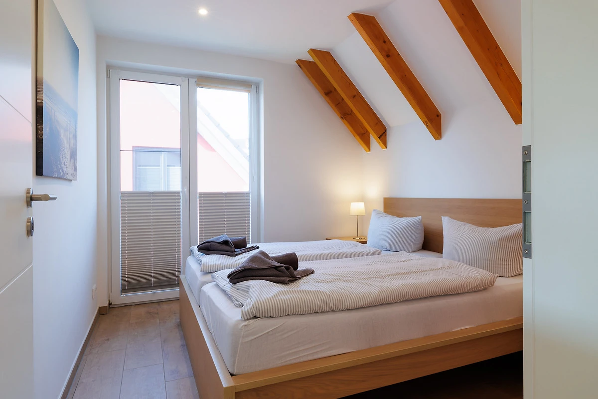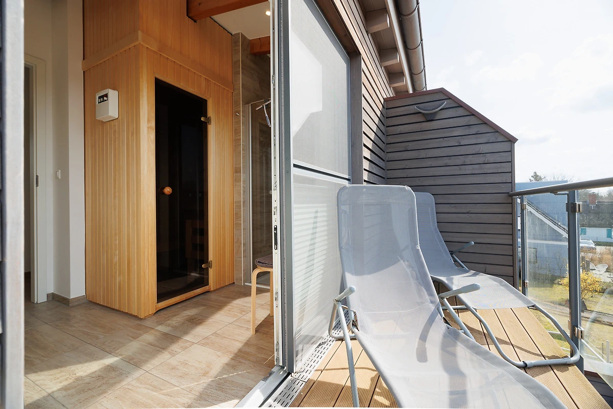 Im Dachgeschoss ist das 2. Schlafzimmer mit Doppelbett 180x200cm ( 2. Etage), ein weiteres Badezimmer mit bodengleicher Dusche (mit getrenntem WC) und die eigene Sauna mit Zugang zum 2. Balkon untergebracht.
