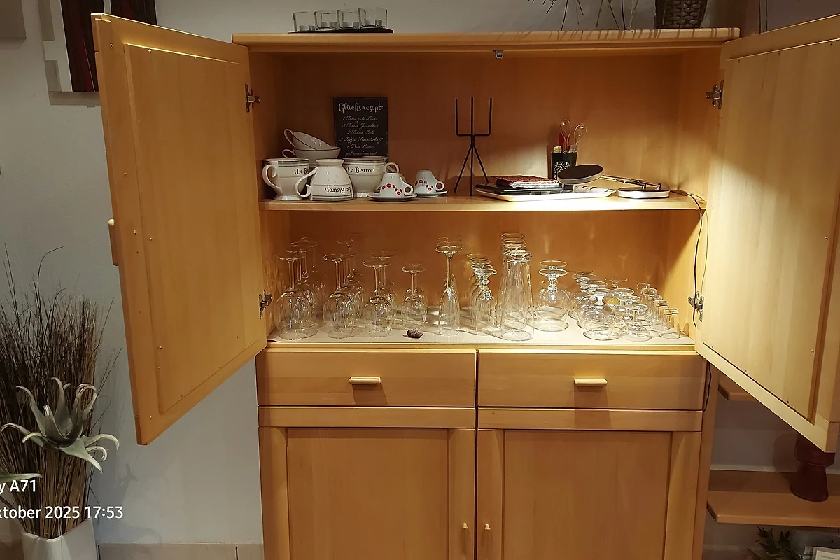 Die Küche ist mit einer Geschirrspülmaschine und Spüle , Mikrowelle, Elektroherd mit Backofen und Ceranfeld, Kühlschrank mit Eisfach, Toaster, Wasserkocher, Kaffeefiltermaschine und Kaffeepadmaschine, Geschirrtücher und Spülmittel, Gewürze uvm. ausgestattet, sodass Sie sich wie zu Hause fühlen werden.
