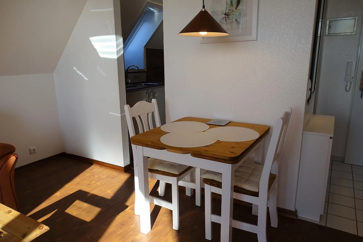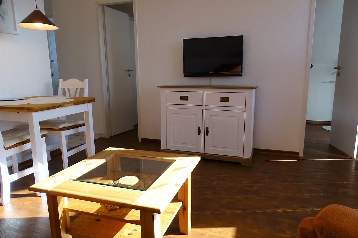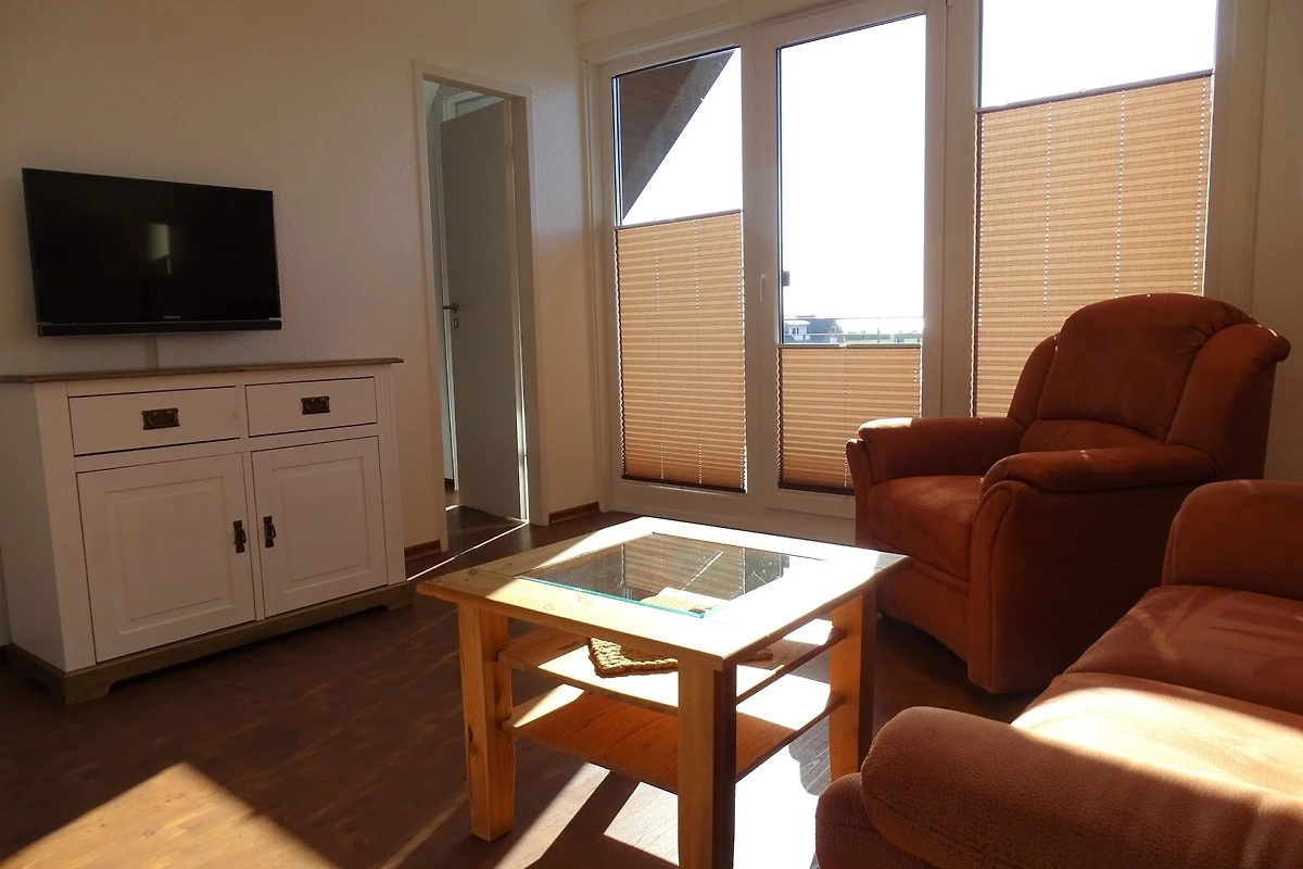 Aufgeteilt ist Ihr Ferienobjekt in Eingangsbereich/Flur, separates WC, separate Dusche, Wohnzimmer mit Couchgarnitur, Esstisch mit Bestuhlung, TV Gerät, Zugang zum Balkon, zur Küche und zum Schlafzimmer. Die Küche ist mit Cerankochfeld, Kühlschrank und Gefrierfach ausgestattet. Das Schlafzimmer ist von 2 Seiten begehbar und verfügt über einen Kleiderschrank und ein Doppelbett mit den Massen 180x200cm. Ruhige Lage, 5 Minuten zum Wald, 3 Minuten zum Strand. Kostenlose Extras ab 7 Übernachtungen: Bettwäsche (Erstausstattung), Pkw-Stellplatz und WLAN. Mindestmietdauer in der Hauptsaison 7 Übernachtungen, in der Zwischen/- Nebensaison mindestens 4 Übernachtungen.