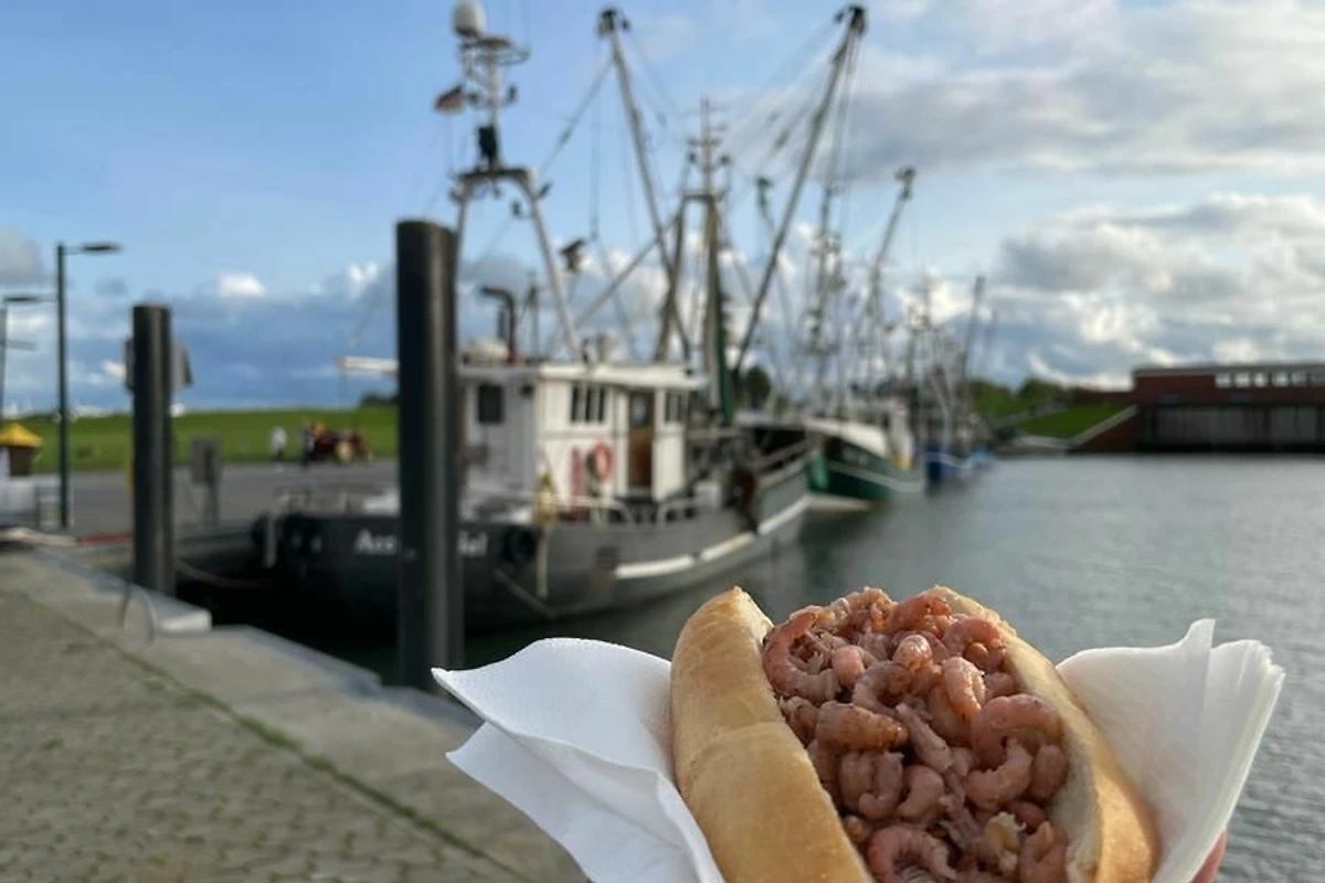 Eiscafes, Supermarkt und dem Hafen mit bunten Krabbenkuttern.