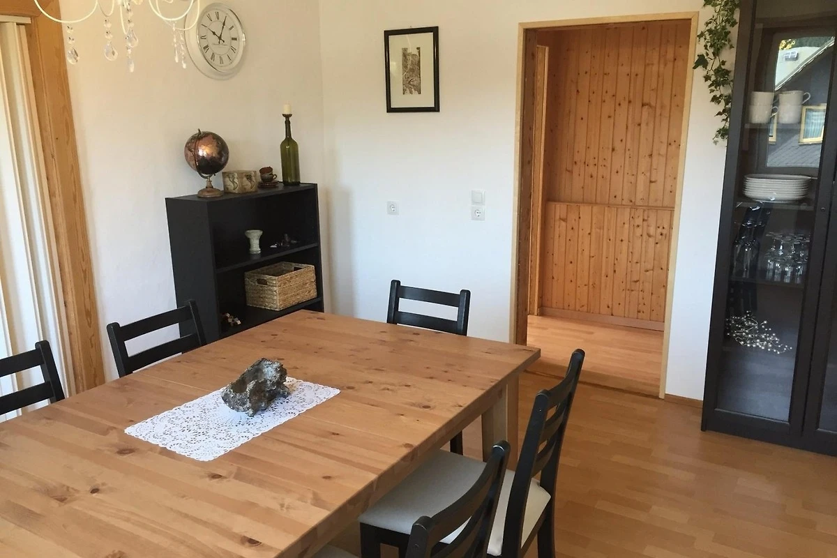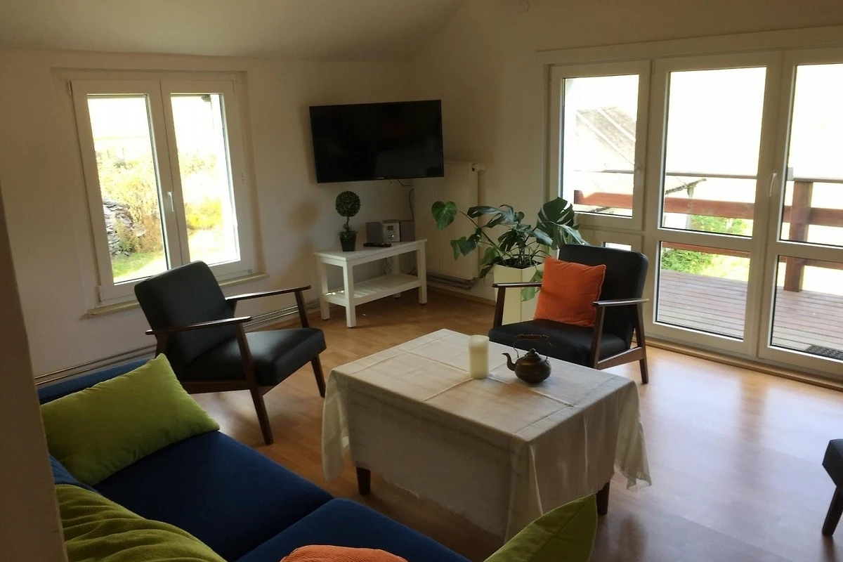 Unsere neuste Ferienwohnung in Friedrichshöhe bietet Ihnen auf 95 qm Wohnfläche ein gemütliches und mit Charme eingerichtetes Zuhause. Ihnen stehen ein Bad, Wohn- und Esszimmer, Küche und drei Schlafzimmer im 1. OG zur Verfügung. Optional können im Erdgeschoss noch 2 Schlafzimmer (4 Betten) und ein Bad auf Anfrage dazu gebucht werden. Vom Balkon der Wohnung blicken Sie direkt auf den Rennsteig und die Wiesen rund um Friedrichshöhe. Geniessen Sie die Ruhe im Naturpark Thüringer Wald abseits der Hektik des Alltags.