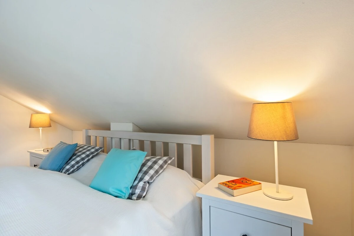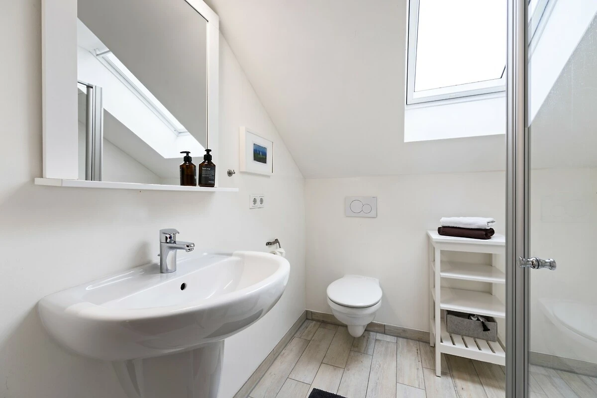 Ins Obergeschoss führt eine geschwungene Buchenholztreppe. Auf dieser Ebene haben Sie aus allen Fenstern wunderbare Ausblicke auf die Schlei Landschaft. In der oberen Etage finden Sie drei Schlafzimmer und ein Duschbad. Zwei Schlafzimmer sind mit Doppelbetten ausgestattet und eins mit einem Einzelbett und Schreibtisch.