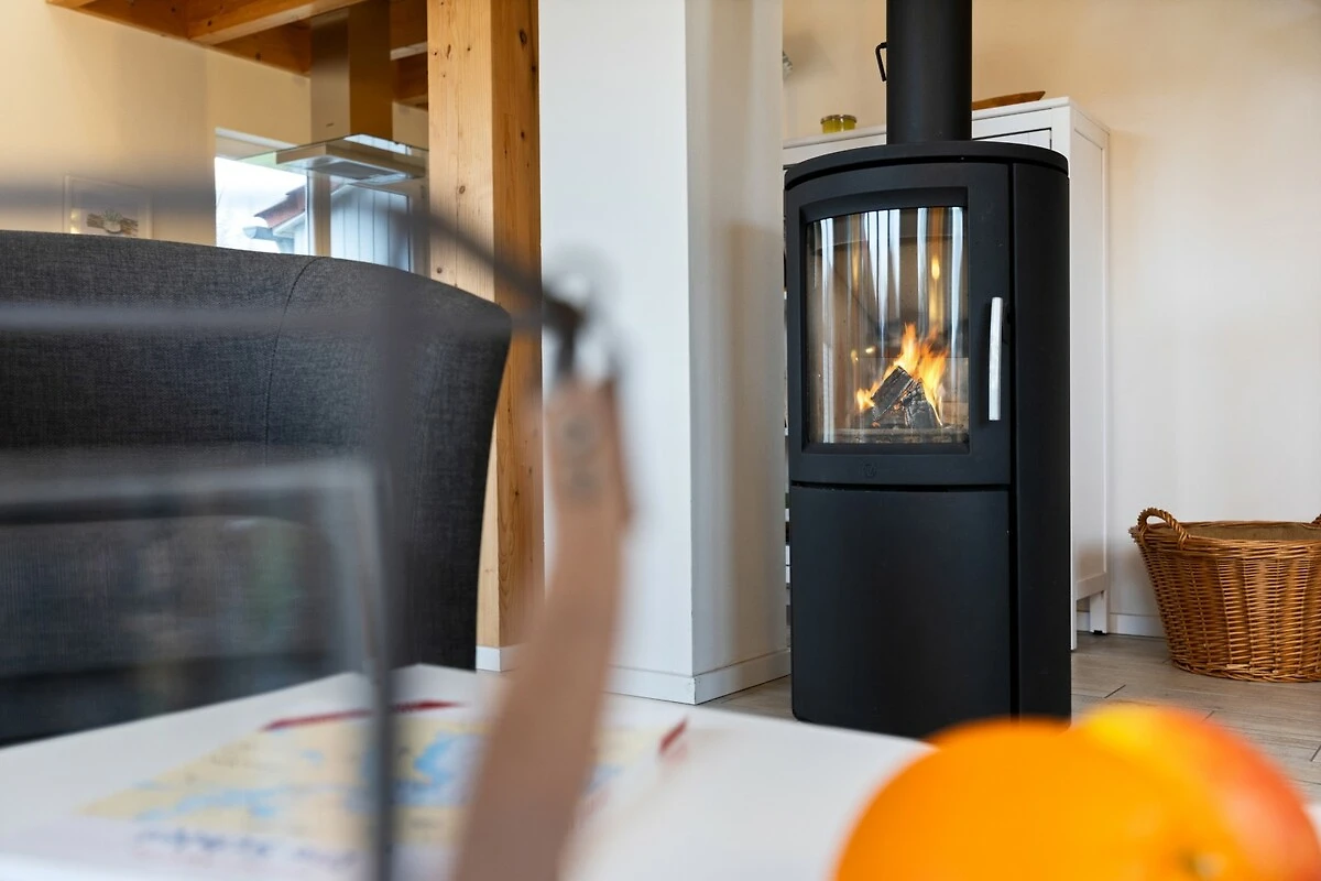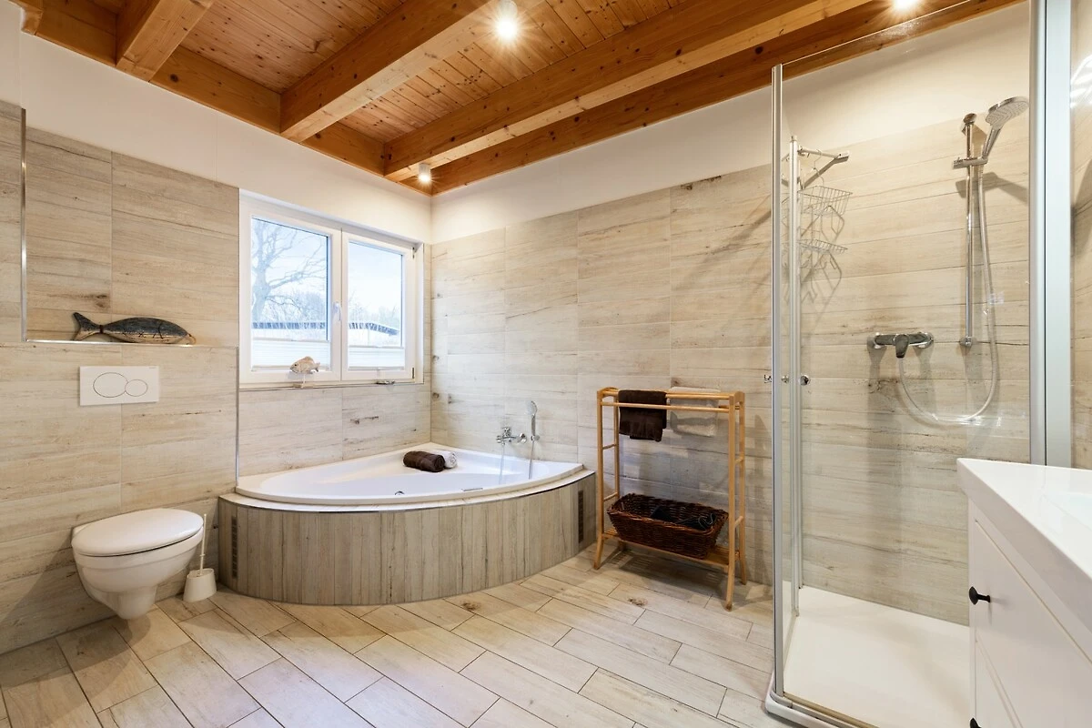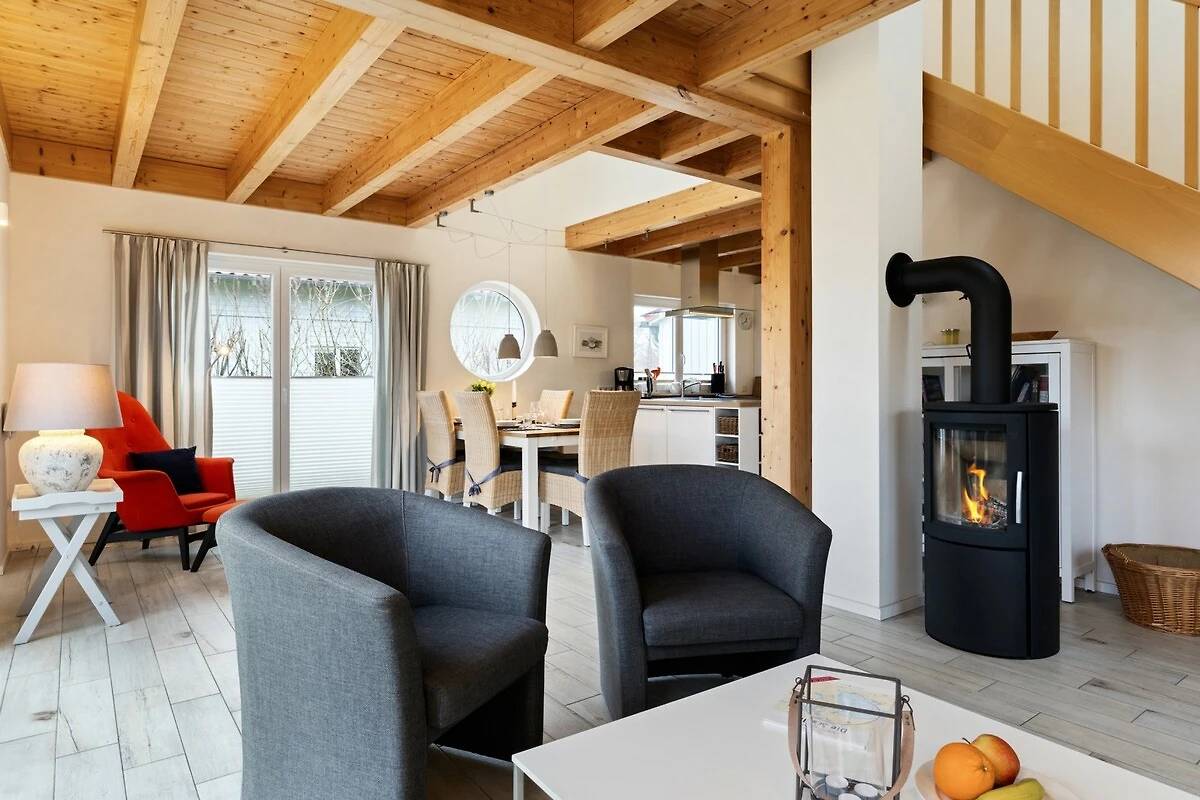 Auch in den kühleren Jahreszeiten finden Sie in diesem ganz aus Holz gebauten Ferienhaus heimelige Gemütlichkeit. Kaminofen, beheizte Bodenfliesen, eine geräumige Sauna (1,80 x 2,00 m) und eine grosse Badewanne mit Whirlfunktion sowie eine helle und hochwertige Einrichtung spielen hier perfekt zusammen.
