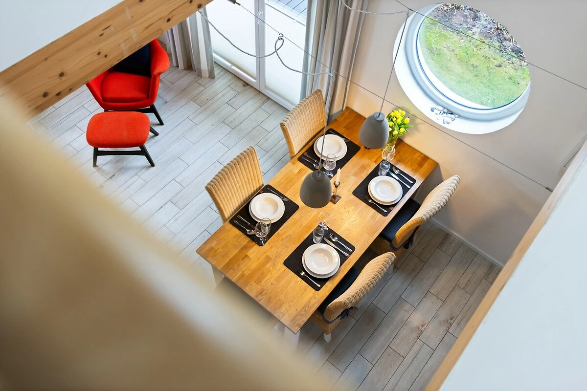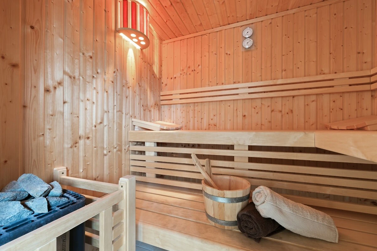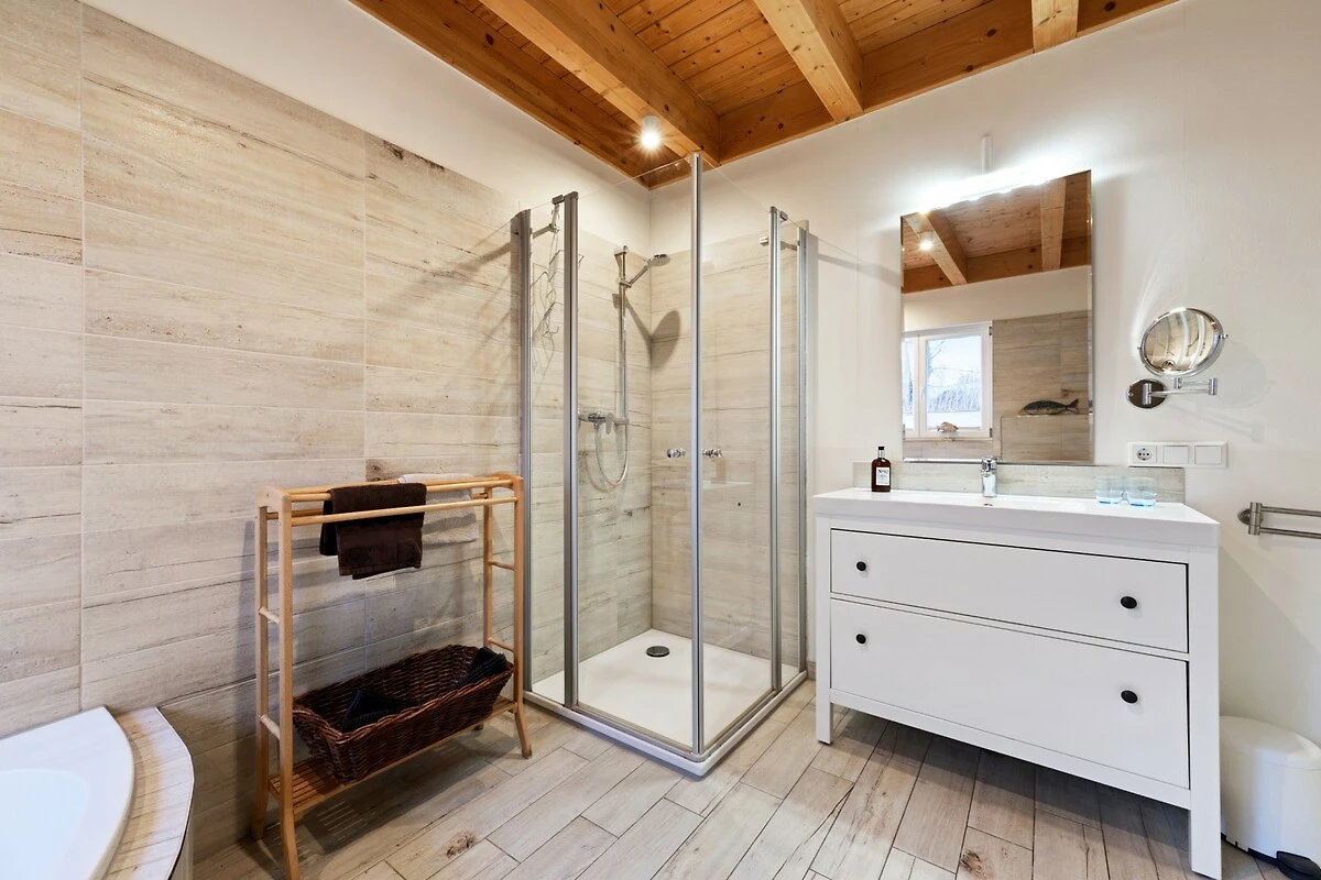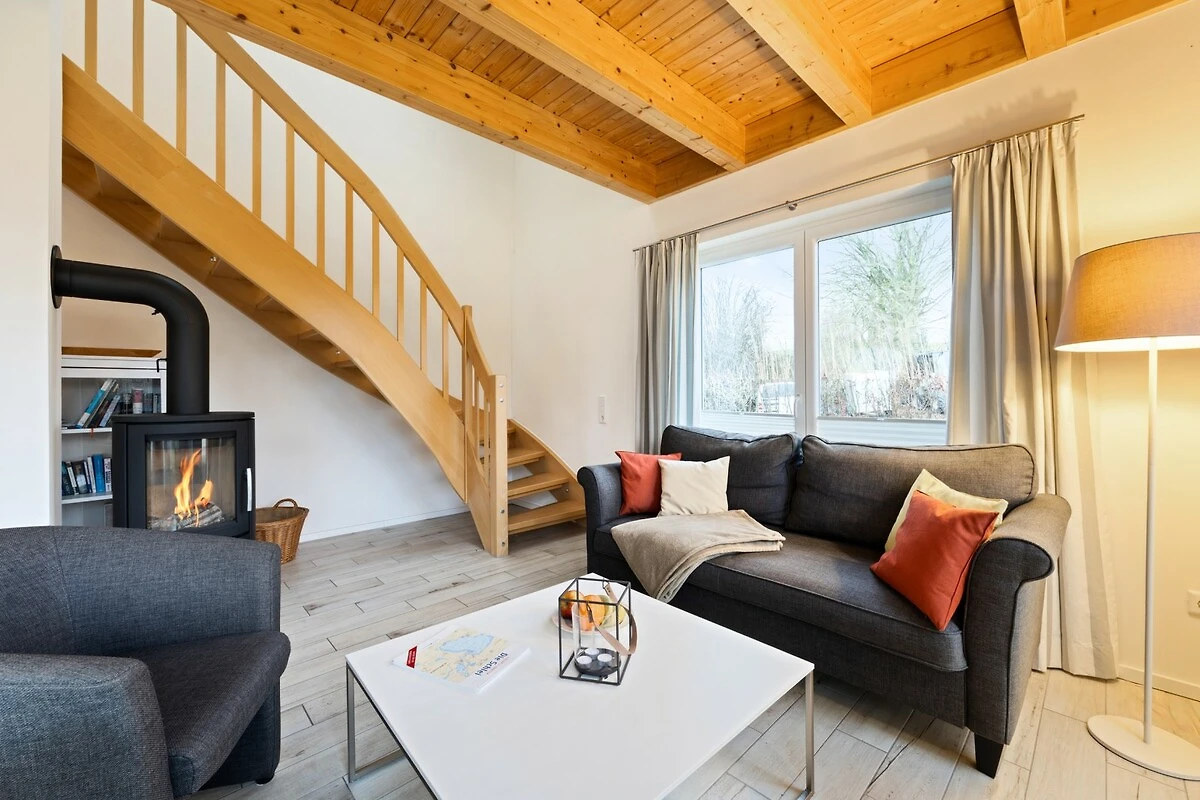 Auch in den kühleren Jahreszeiten finden Sie in diesem ganz aus Holz gebauten Ferienhaus heimelige Gemütlichkeit. Kaminofen, beheizte Bodenfliesen, eine geräumige Sauna (1,80 x 2,00 m) und eine grosse Badewanne mit Whirlfunktion sowie eine helle und hochwertige Einrichtung spielen hier perfekt zusammen.