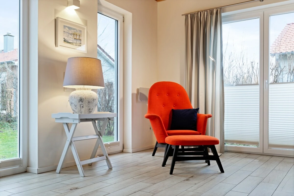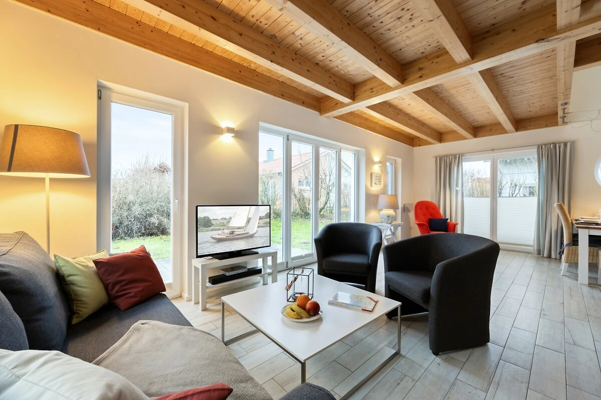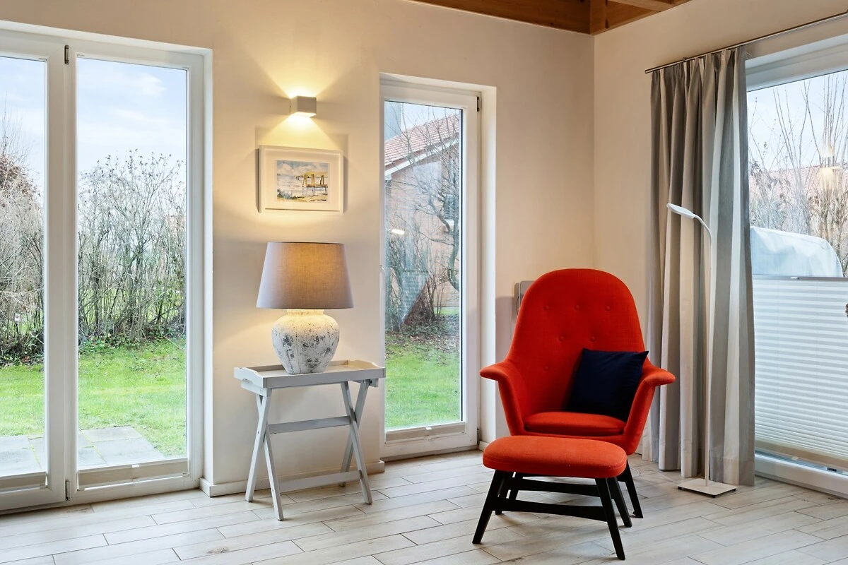 Das "Rapsblütenhaus" ist bestens geeignet für Familien oder befreundete Pärchen, die auch im Urlaub nicht auf Platz und Komfort verzichten möchten. Ein abschliessbarer Schuppenanbau bietet Platz für Ihre Fahrräder oder Wassersportausrüstung. Auf der Terrasse wartet ein Strandkorb auf Sie und Ihre Lieblingslektüre.