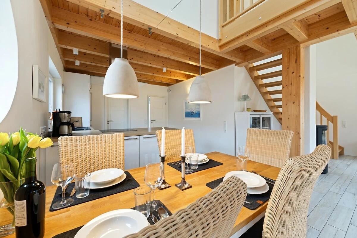 Im Erdgeschoss liegt der helle und gemütliche Wohnbereich mit Kaminofen, grosszügigem Essbereich, offener Küche, Hauswirtschaftsraum, Wellnessbad Flur und Gäste WC. Durch die bodentiefen Fenster haben Sie direkten Zugang zur Terrasse und dem grossen Garten. Das Haus ist umgeben von regionaltypischen Gewächsen, wie Flieder und Haselnuss.