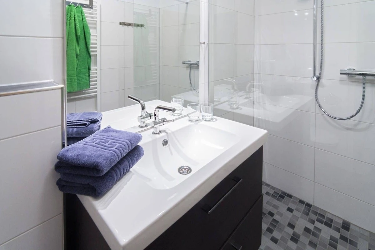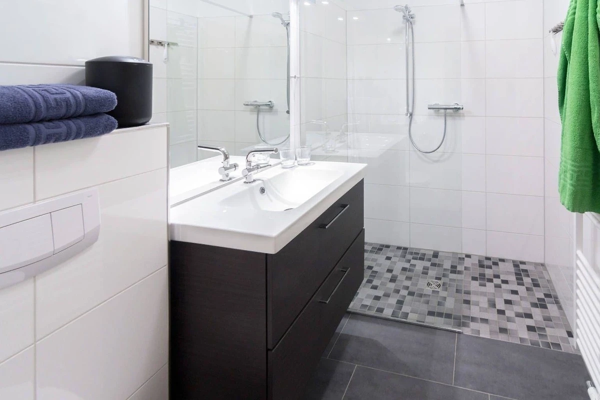 Ein modernes Badezimmer mit einer bodengleichen Dusche, Haartrockner und Spiegel sorgt für zusätzlichen Komfort. Zur Unterhaltung steht eine HiFi-Anlage, ein DVD-/Blu Ray-Player und ein TV bereit. Die Wohnung ist mit WLAN ausgestattet und bietet einen Esstisch sowie ein gemütliches Sofa. Ein Kinderhochstuhl ist ebenfalls vorhanden. Für zusätzlichen Komfort gibt es eine Waschmaschine, einen Wasserkocher und einen Staubsauger. Ein Sonnenschirm rundet die Ausstattung ab. Hier kann man eine erholsame Zeit verbringen.