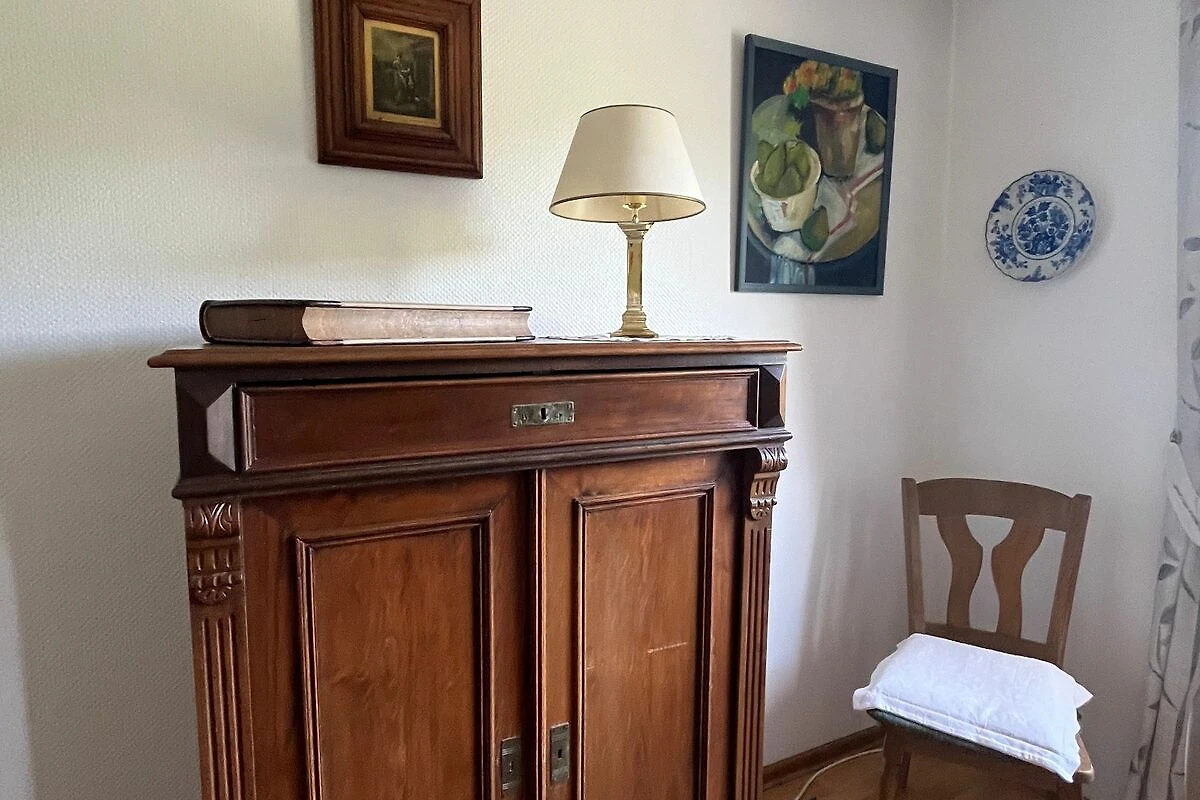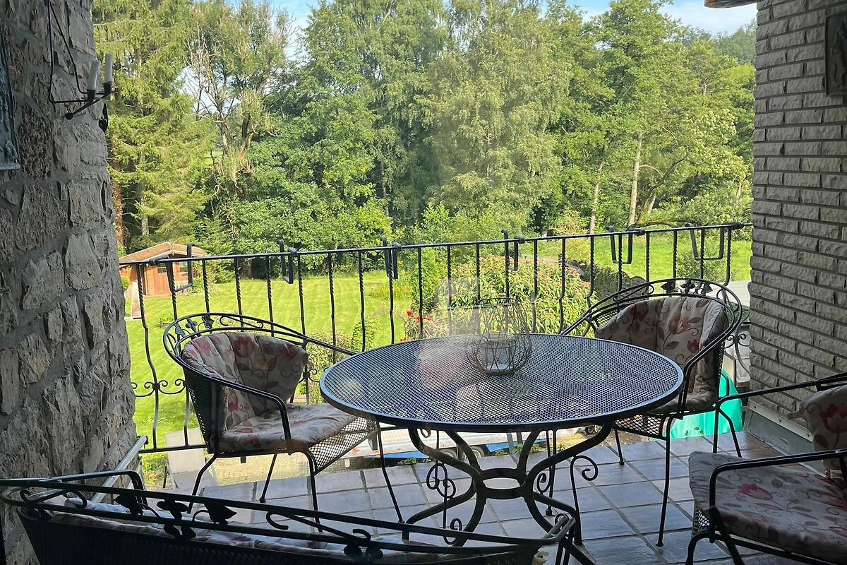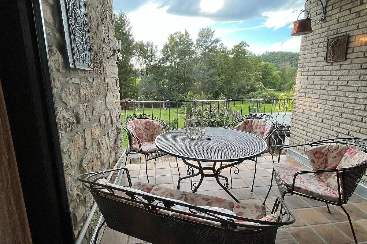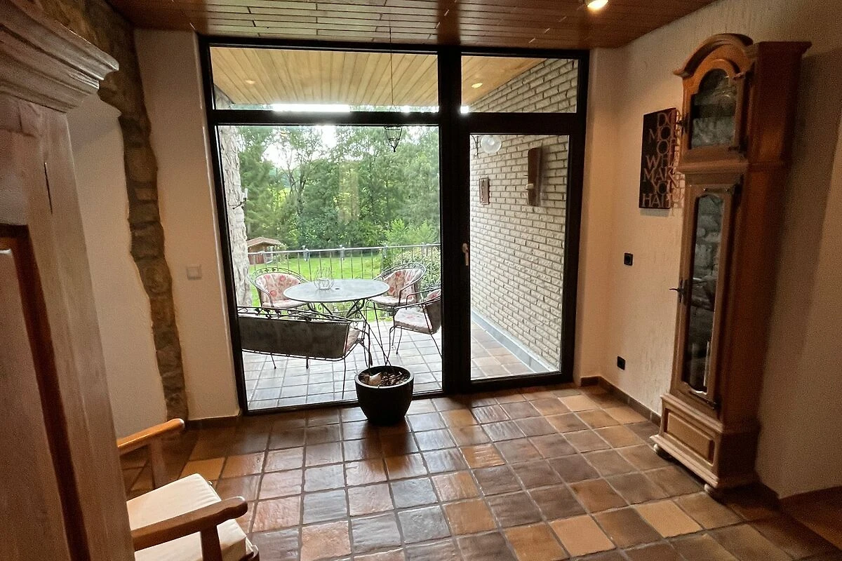 Sie betreten die schöne Ferienwohnung über einen eigenen überdachten Hauseingang. Nach Öffnen der Haustür betreten Sie zuerst die grosse Wohndiele mit ihrer grossen Bruchsteineand und dem aufregenden Blick auf die grosse Loggia. Von hieraus eröffnet ein toller Blick auf das grosse Grundstück, den dort befindlichen Teich und die tolle Natur.